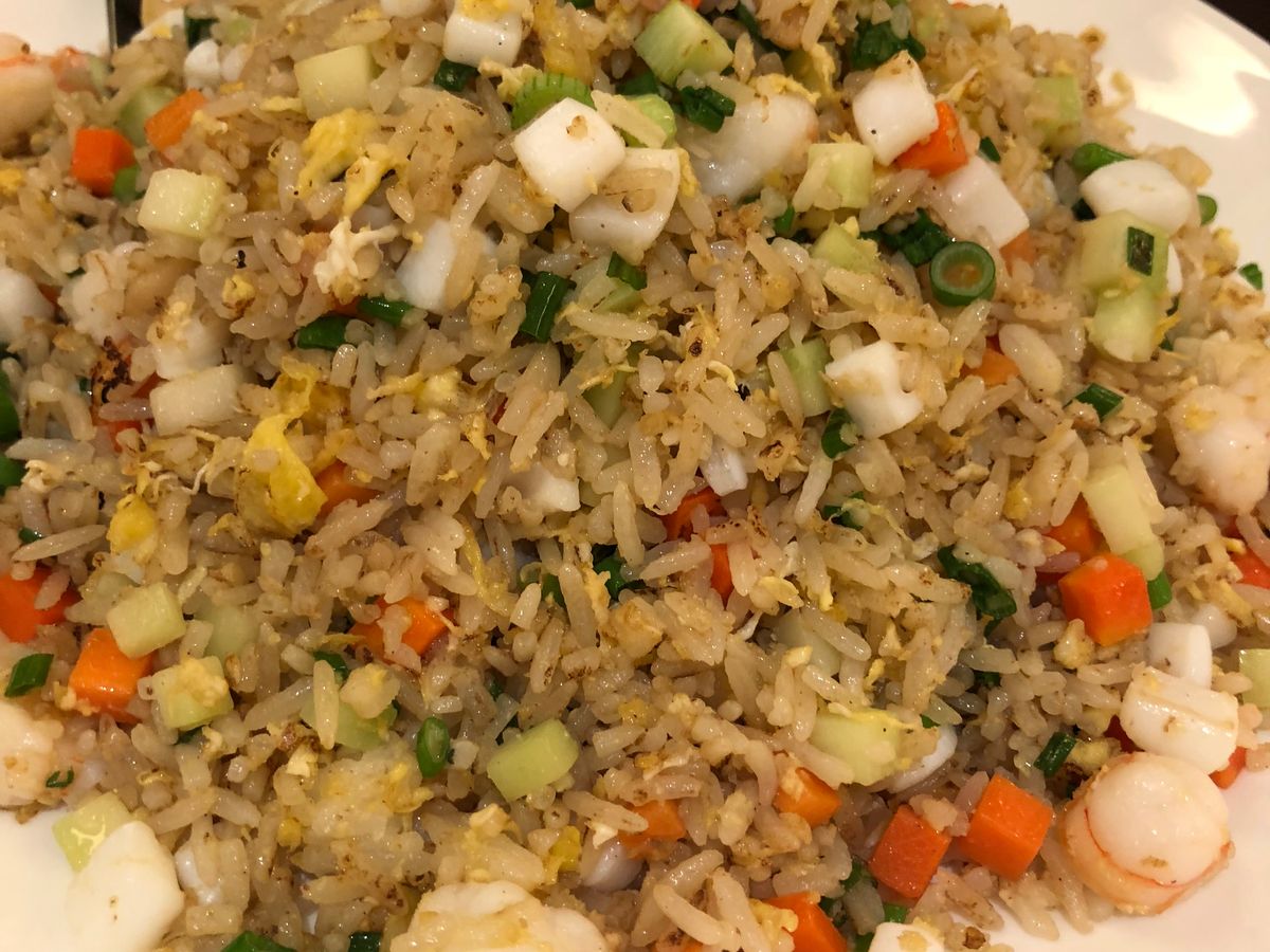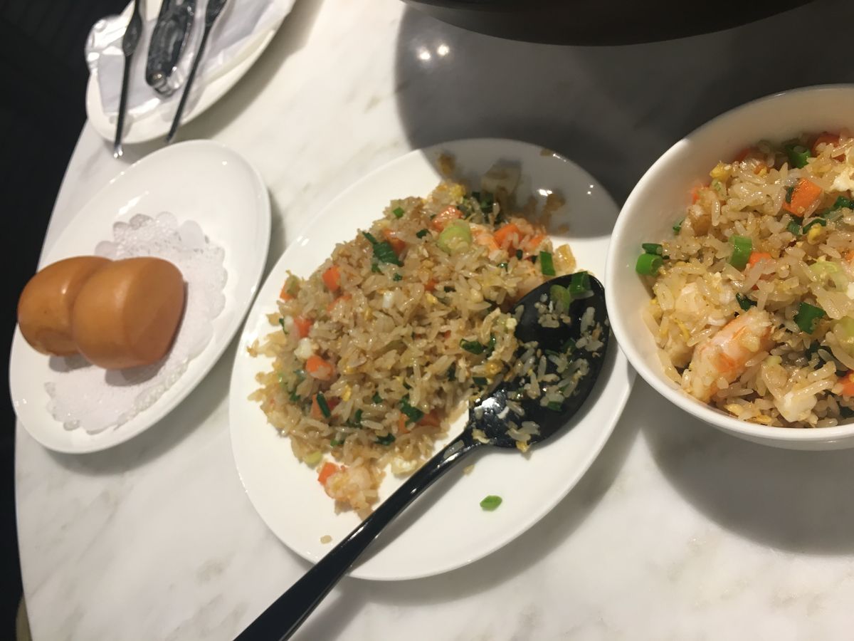 チリクラブが出てくるのと、ほぼ同じタイミングでチャーハンを持った店員さんが、置き場に困り、離れたテーブルにそれを置き、先2品のお皿が空いた途端に、お茶碗ギュウギュウに詰めて置いていきました。