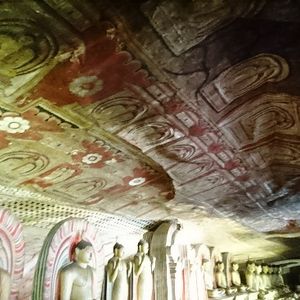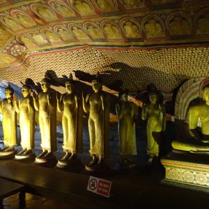5つの石窟からできた黄金寺院、ダンブッラ。これらの石窟は全て自然の洞窟を利用し、シンハラ王朝が建造、修復したものです。5つあるうちの3つの石窟は、11世紀に金箔で覆われた73体の仏像が置かれたため、黄金寺院の呼び名がつきました。数々のきらびやかな仏像や仏教説話を描いたフレスコ壁画は圧巻です。