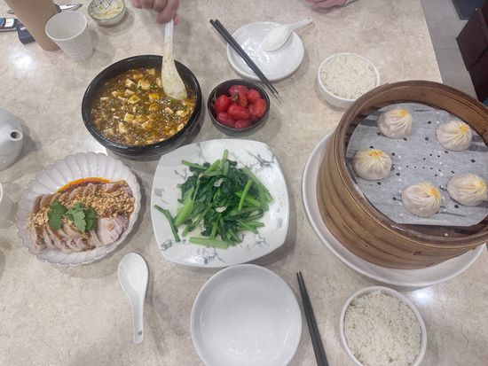 お店に入ってすぐにバウチャーをスタッフさんに渡すと席に案内してくれました。 ラインナップはオリジナル小籠包、蟹みそ入り小籠包、大根もち、麻婆豆腐、野菜炒め、鶏の蒸した物、白いご飯、トマトの漬物、お茶でした。 大根餅がすごい美味しくて台湾で食べた中で一番美味しかったのでおすすめです!麻婆豆腐は八角が効いててピリ辛なので辛いのが好きな方はハマる味です。台湾人の友達と一緒に行ったのですがここは台湾人にも