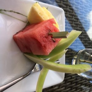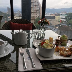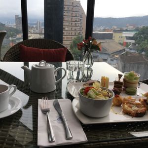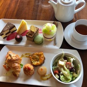 アフタヌーンティーは前菜とデザートに分かれていました。前菜はどちらというと海鮮メインでしたが、あまり好きではない私でも美味しくいただくことができました。デザートはふつうに東京都心で店を出せるぐらい美味しかったです。またレストランから見える景色かいいですよ。流れている音楽がなかなかいいですね。