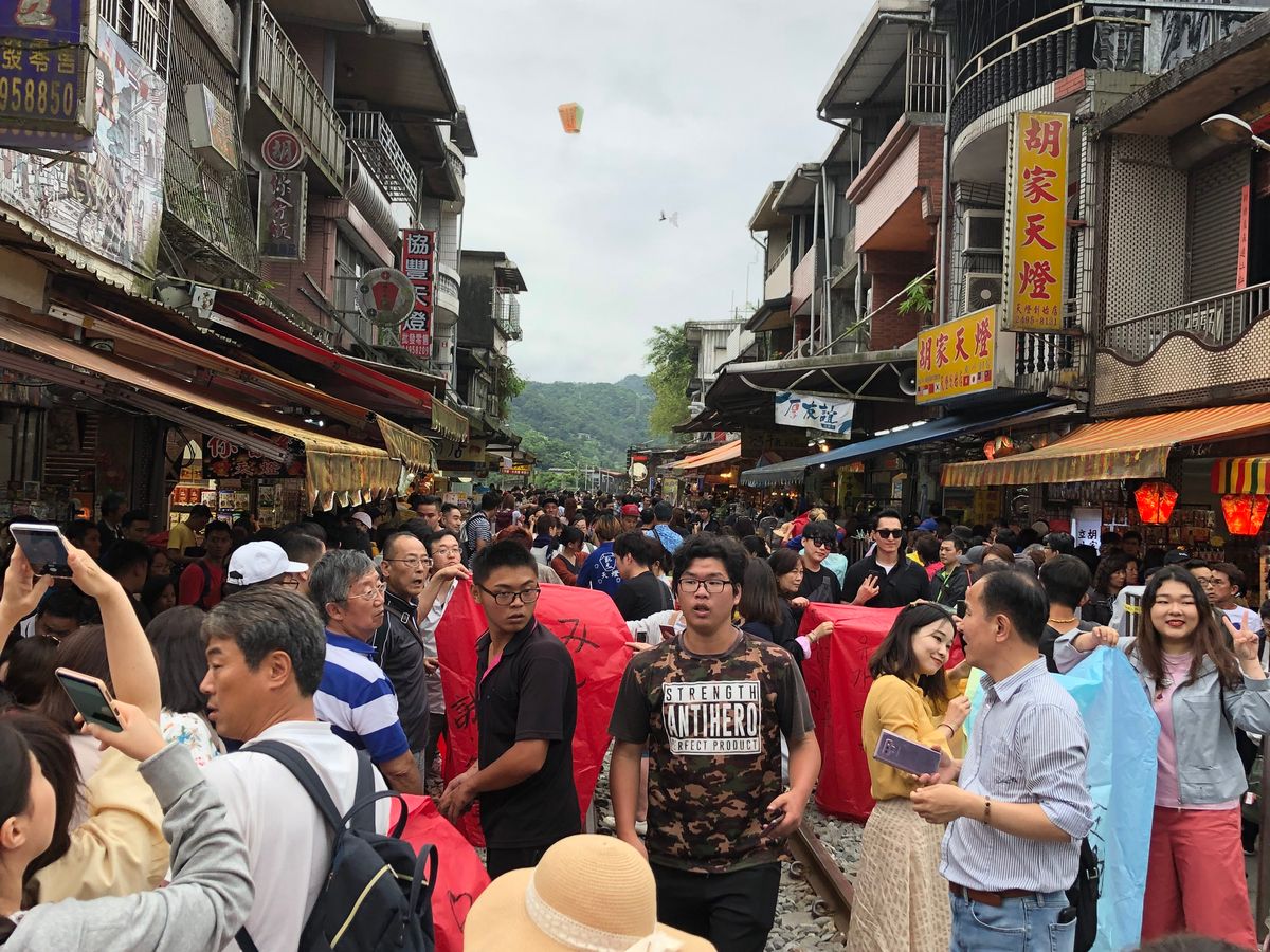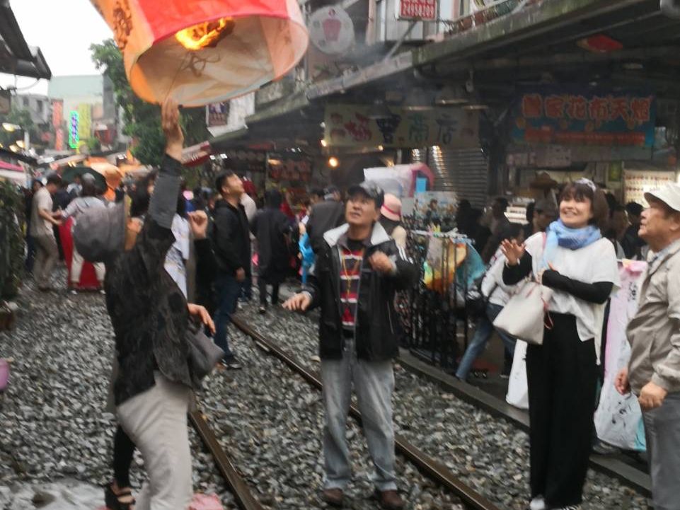 最初に案内してくれた十分では良い天気で、天燈上げの写真を撮ってもらえて良い記念となりました。九分は昼間なのにすごい人!途中にわか雨!その後の