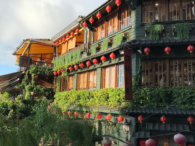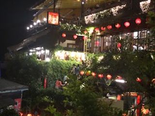 九分・十分は大雨で、十分でのランタン上げは風に煽られ空に舞う前に燃えてしまい残念でした。また、九分でも大雨でしたが、その為か阿妹茶楼も向かいの海悦楼も空いていました。私は阿妹茶楼には依然行ったので海悦楼に入りました。(移動中にガイドさんが予約を入れてくれました。ガイドさんに強くいきたいと伝えるのがいいと思います)この店からでないとガイブックにあるような写真は取れないのでは・・・(おすすめです。オーナーが帰りに阿妹茶楼を背景に写真を撮ってくれました。)