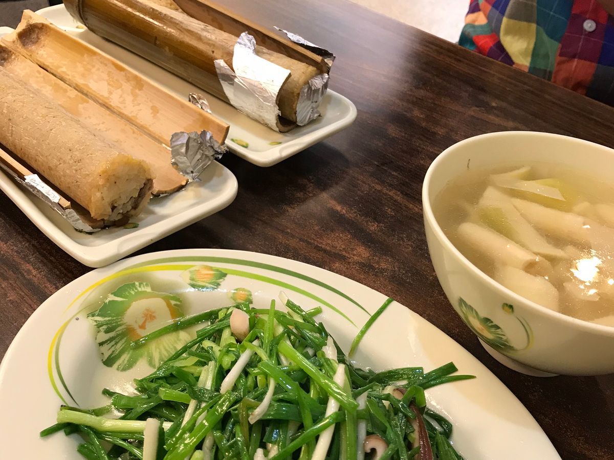 烏来では食事をしましたが、珠葱という名産の葱がおいしいと教えてもらい、炒め物を注文、名物の竹筒飯など美味しくいただきました。