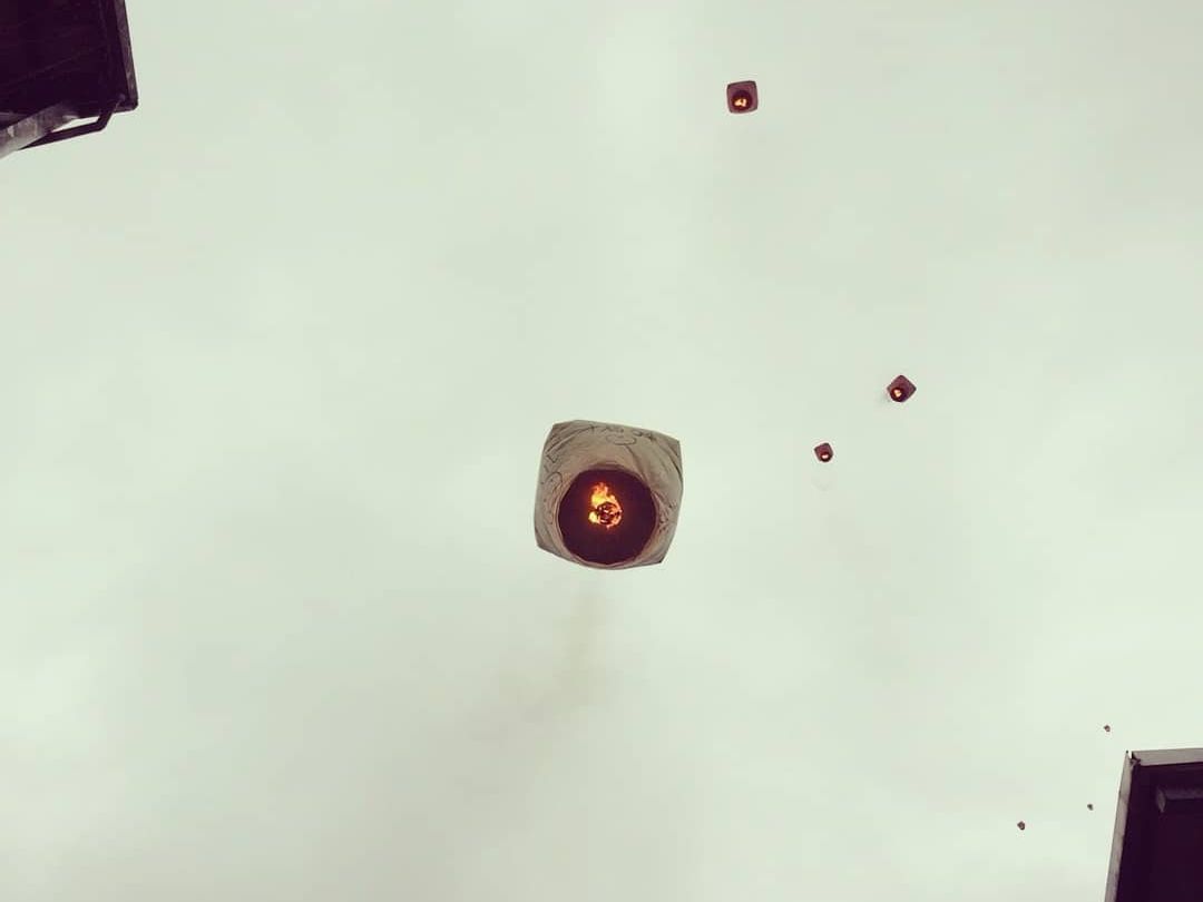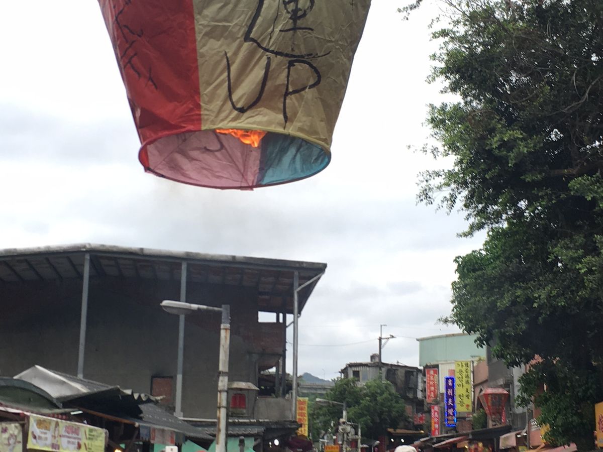 十分老街で天燈上げ体験今回の旅のメインイベントかな♪皆で天燈の色を決めて、1面ずつ願いを書いて、お店のお兄さんが手際良く指示してくれるままにハイポーズwあっという間に私達の天燈が空高く舞い上がっていきました。お兄さんも写真をいっぱい撮ってくれるし、ドライバーさんも動画を撮っていてくれて謝謝