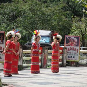 少人数での車での移動でした。台北から1時間。そこから日本軍が作ったというトロッコに乗り換えました。これががたごととゆれて実にレトロな雰囲気。風を感じながら山河、白糸の滝を眺めました。その後、到着したとたん民族衣装を着たきれいなお嬢さんたちが出迎えてくれました。写真をとろうとしたらすぐにポーズをとってくれるし写真も写してくれる。その前の建物で(お土産を販売してる)お茶を出してくださり、いろいろ話しかけてくれました。「そこ暑いでしょ。こちらにどうぞ」とクーラーの前のいすを勧めてくれたり、とってもフレンドリー。そして日本語ぺらぺら。なんでも酋長さんが軍隊で日本人と仲良しだったそうです。機織も見せてもらい、3階でダンスショーを見に行きました。次々衣装をかえてダンサーの人たちでなく最後は観客全員とダンス。これが結構たのしかった。フォークダンスみたいでさらにタイヤル族の人とツーショットで写真をとってくれてこれをきれいに写真たてにいれてくれる。思い出にと購入させていただきました。とにかく優しい、気がいい。心が温かい。もっと多くの人に来てほしいなぁと思いました。本当に一生懸命にダンス、そして歌を聞かせてくれます。お客さんの人数が少なくとも手抜きなし。贅沢なひと時を過ごせました。タイヤル族の人たちは目が大きくて鼻が高くて彫りが深い美人さんたちでした。台北から本当に近くで貴重な体験ができるのでお勧めです。