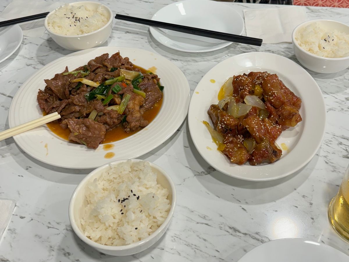 古窓レストランの食事は4品+スープ、白米です。うち2品の食事は画像のとおり(食べかけですみません)。残りはキャベツオンリーの塩炒めと別の肉の炒めもの(ただしメインの肉が違うだけで味と具材は写真に写っているものとほぼ同じ)と金針菜か何かのスープでした。しっかりした無難な味付けで白米には合いますし普通に美味しいですが、町中華レベルですし、サービスもレストラン従業員の家族?らしき小中学生の子どもがおぼつかなく運んでくる感じです。レストラン内も煌々と明るいので窓に反射して夜景は見えません。来店する客も、おそらくツアーの家族や団体ばかりです。ただ、大混雑で気の休まる場所がない九份で、確実に静かな場所で休憩し、空腹を満たせるというところにこのツアーの価値があります。食事つき休憩所を確保するつもりで申し込まれるとよいと思います。