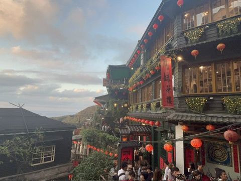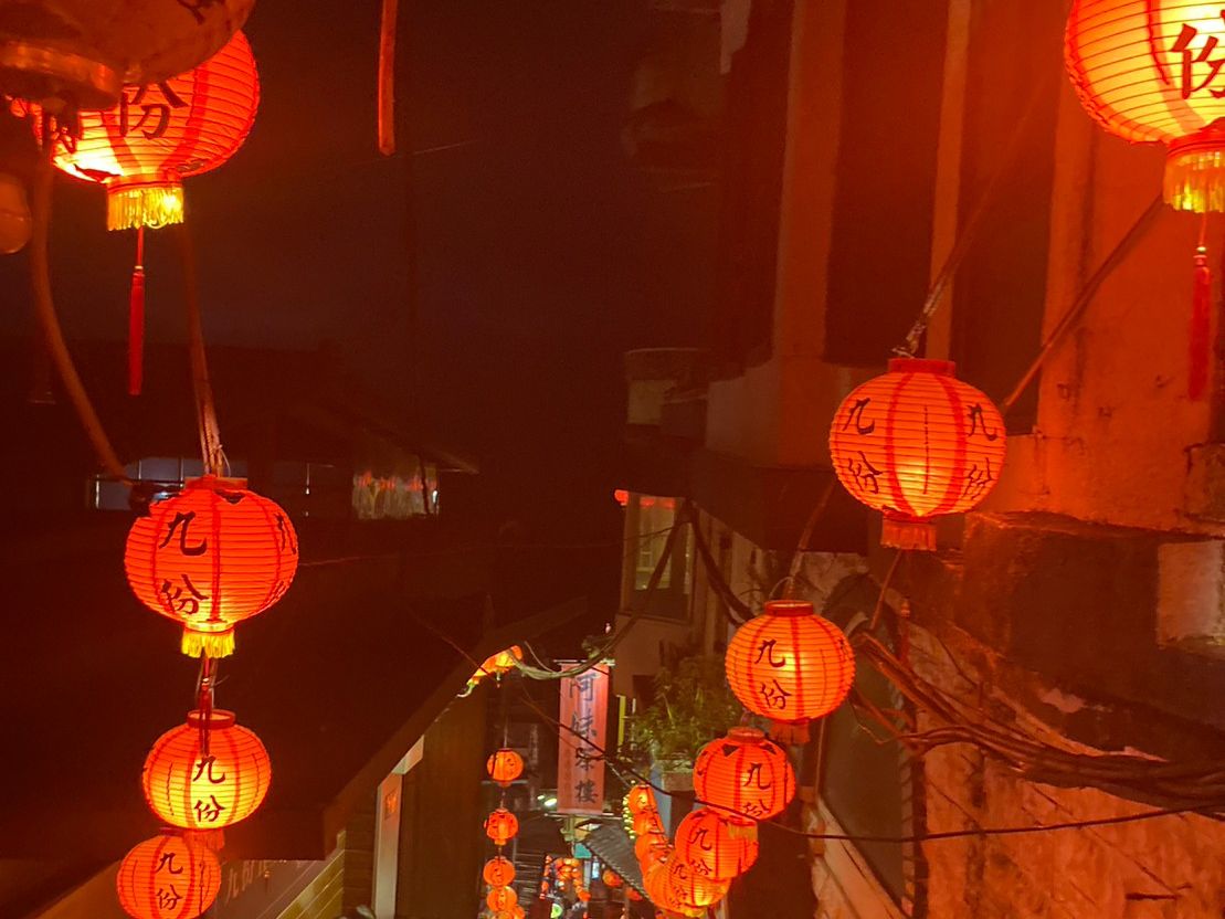 九份には19時ごろに到着したと思います。お店が早く閉まってしまうと聞いていたので、どこもやっていなかったらどうしようと心配していました。体感では半分程度店じまいをしていて、少し残念な気持ちもありましたがガイドさんお勧めのお店で食べた芋餅?のスイーツがとても美味しかったです。