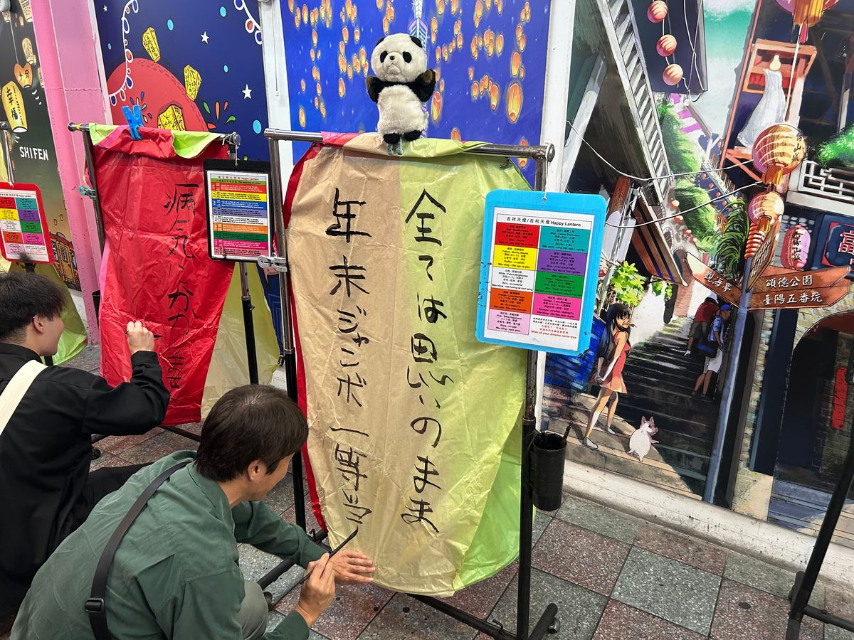天燈上げは、天燈に願い事を筆で書き込むのですが、筆の柄が墨汁で汚れていることがあるのでウェットティッシュを持参することをお勧めします。トイレがあるのでそこで手を洗うこともできます。