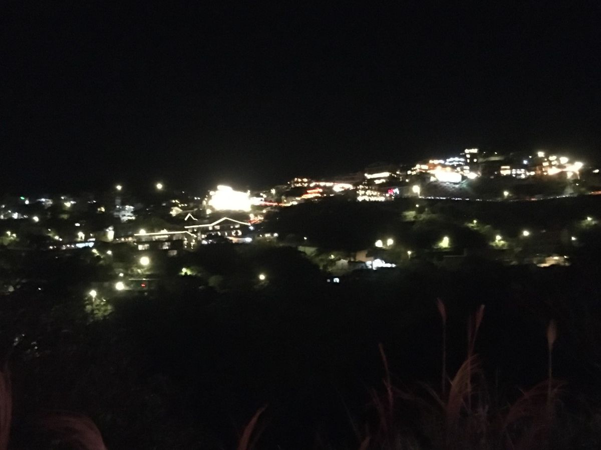 現地には午後の4時過ぎに着き、山腹の茶屋から海を眺める夕暮れの景色は絶景と言えるものでした。日が暮れてから十份へ移動中、現地を振り返ると九份はキラキラと輝いていました。