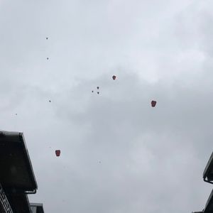 雨の中、スタッフさんが手際よく写真撮影をし、ランタンを上げてくれましたが、私たちのランタンは空高く上がる事なく、何度も地面に落ちる始末・・・。