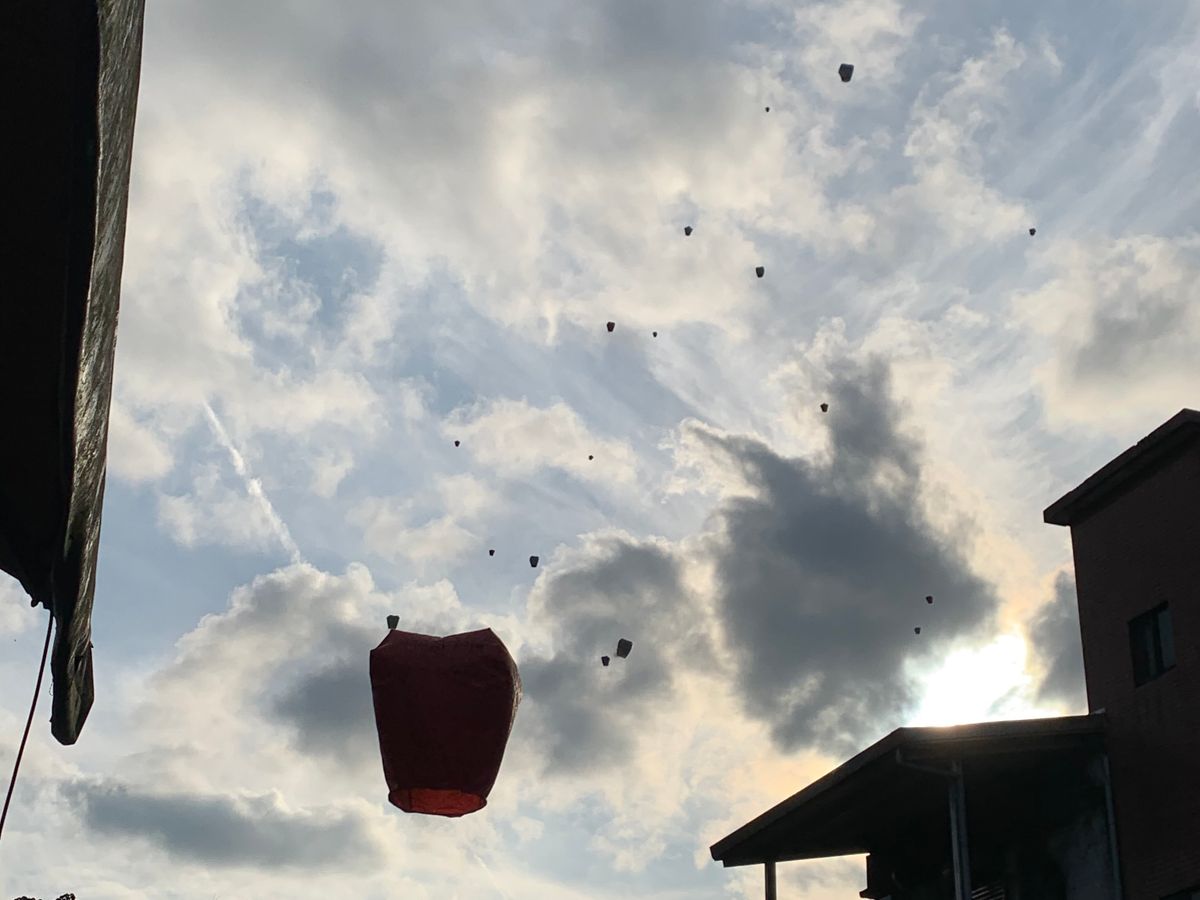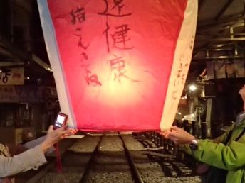 最初に訪れた十分での点燈上げの際には、雨はやんでいて、4面に願い事を欲張ってしたためた点燈が、熱をはらんできれいに空に上がっていく姿はとても感動的でした。ちなみに、願い事を書くときに、墨と筆を使うので、万が一のことを考えて、白っぽい洋服は避けた方が無難です。