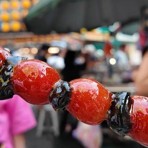 その後訪れた基隆廟口夜市では、食べものすべてが美味しく、大満足でした。特に、プチトマトとシロップ漬けした梅を串にして、りんご飴のようにコーティングされたお菓子がとても美味しく、印象に残っています。