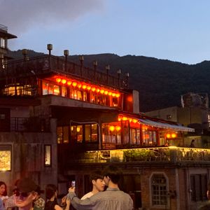 九份到着後、ガイドさんから集合時間などの説明を受けた後、ツアーで予約して貰ったお茶屋さんへガイドさんが案内してくれました。お茶屋さんの外には長蛇の列ができていましたが、ツアーで予約した我々は、お茶屋さんの裏手の階段から直ぐに店内に案内してもらえました。列に並んでいたら数時間はかかると思います。絶対にツアーに参加してお茶を頂くのが良いと思います。お茶屋さんから見る九份の景色は最高でした。記念写真も沢山撮ることができました。このツアーは九份にたっぷり3時間滞在できるので、九份をゆっくり散策することが出来ました。20時ごろには通りのお店は閉店するため観光客は少ないので写真スポットでゆっくり写真を撮ることができました。また、ぜんざいの人気店やタピオカミルクの幸福堂、草団子のお店も、ほとんど並ぶことなく堪能できました。