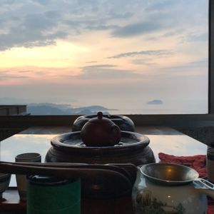 残念ながら、当日は曇っていたため綺麗な夕日は見れませんでしたが、もう日が沈んだ18時40分頃、再度「阿妹茶樓」に行くと並んでなく、念願のテラスでお茶ができました。1人300台湾ドルでお茶は飲み放題です。茶菓子も4種類出てきましたが、どれも甘さ控えめで、甘いものが苦手な方でも美味しくいただけると思います。