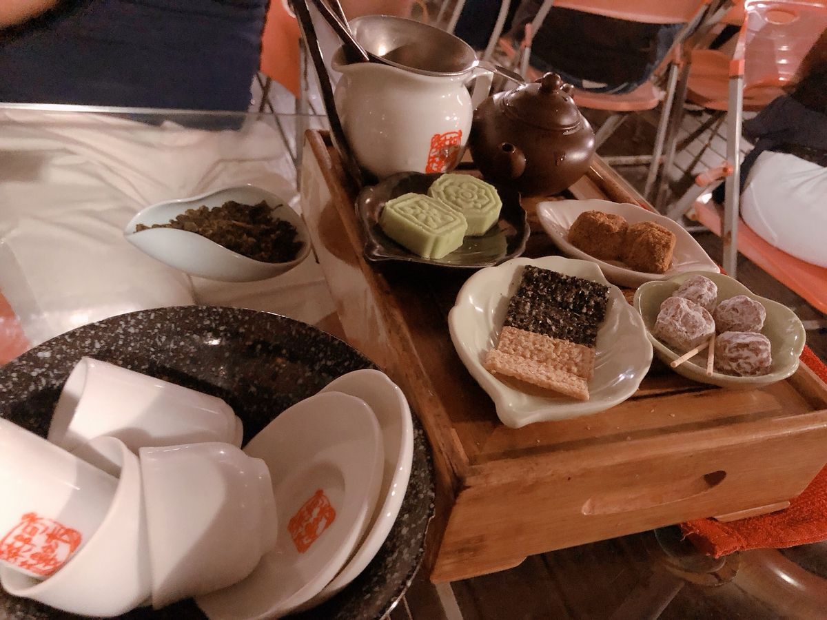 その後、九份茶坊での台湾茶と烏龍茶のチーズケーキをいただきながらのカフェタイム。九份というと街並み歩きのイメージですが少しずつ夕暮れに向かう風景を眺めながら1時間ほどのゆったりとした時間を過ごすのもまた格別です。注文外の銘柄のお茶(3種類ほど)の試飲サービスがあり、いろいろな台湾茶を体験できました。