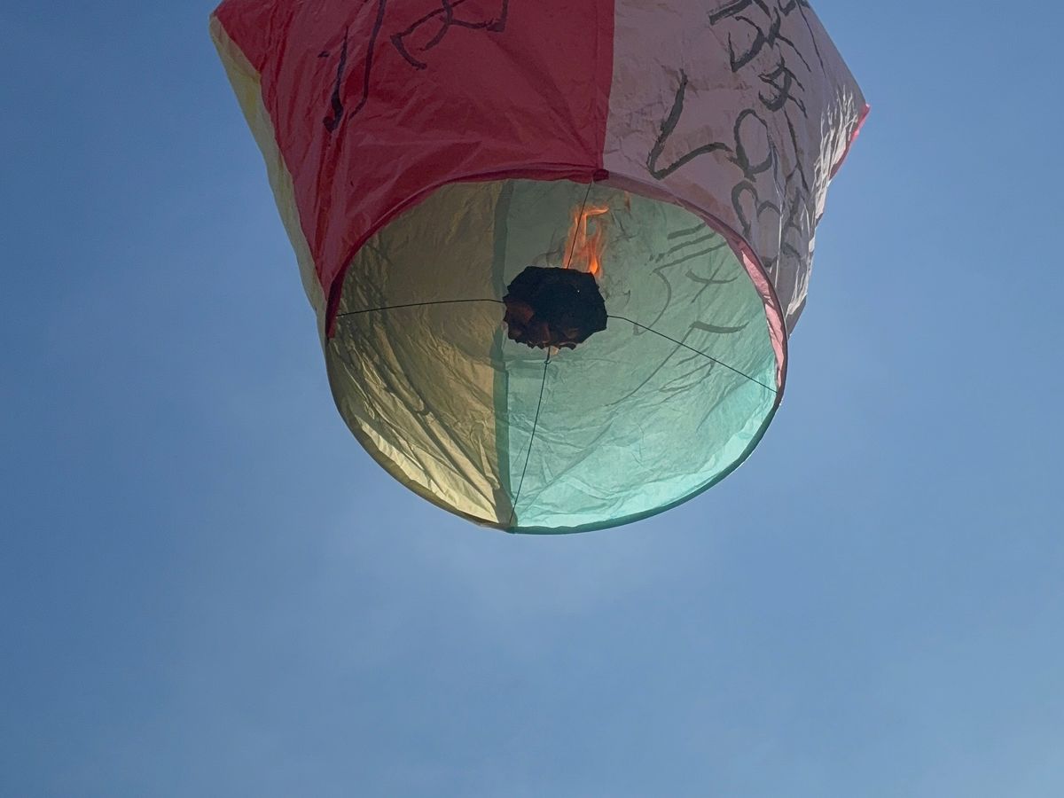 赤いランタンは夕方の空へ上がって行きました♪思いを届けてくれますね🎵
