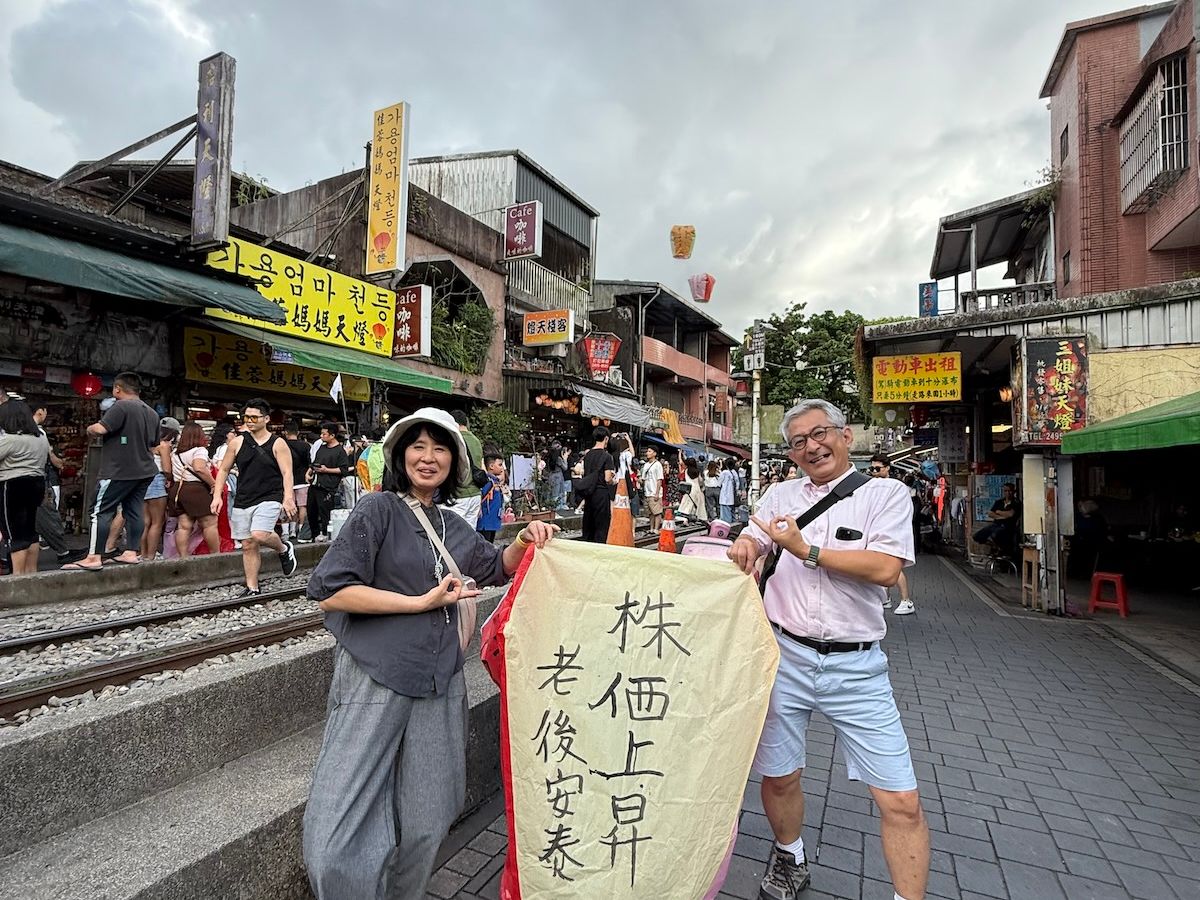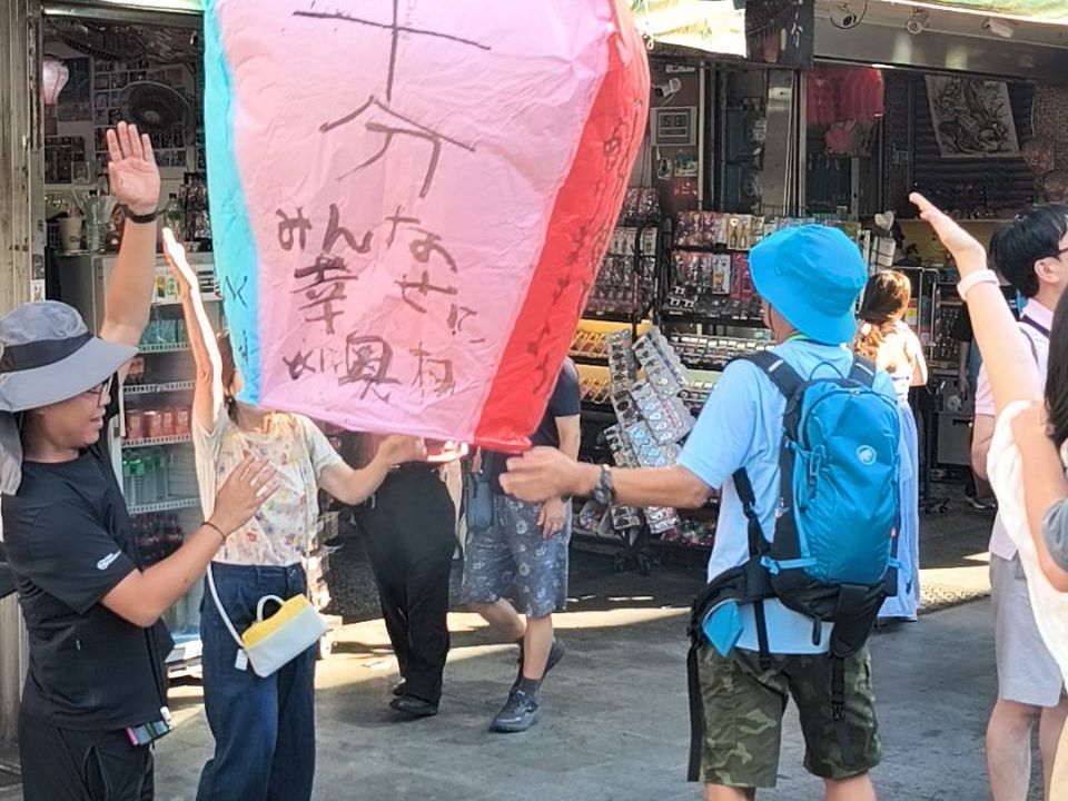 時間通りホテルにてピックアップしていただき、二日目に十分の予定ツアーでしたが、先に向かいました。これが功を奏して翌日、十分の滝は小雨の中となりましたが、灯籠上げは雨を回避することができました。家内が事前に書くことをある程度決めてきましたが、普段日本語を書かないため、なかなか二人で苦労しつつも完成。灯籠も無事上がり大変いい思い出になりました。
