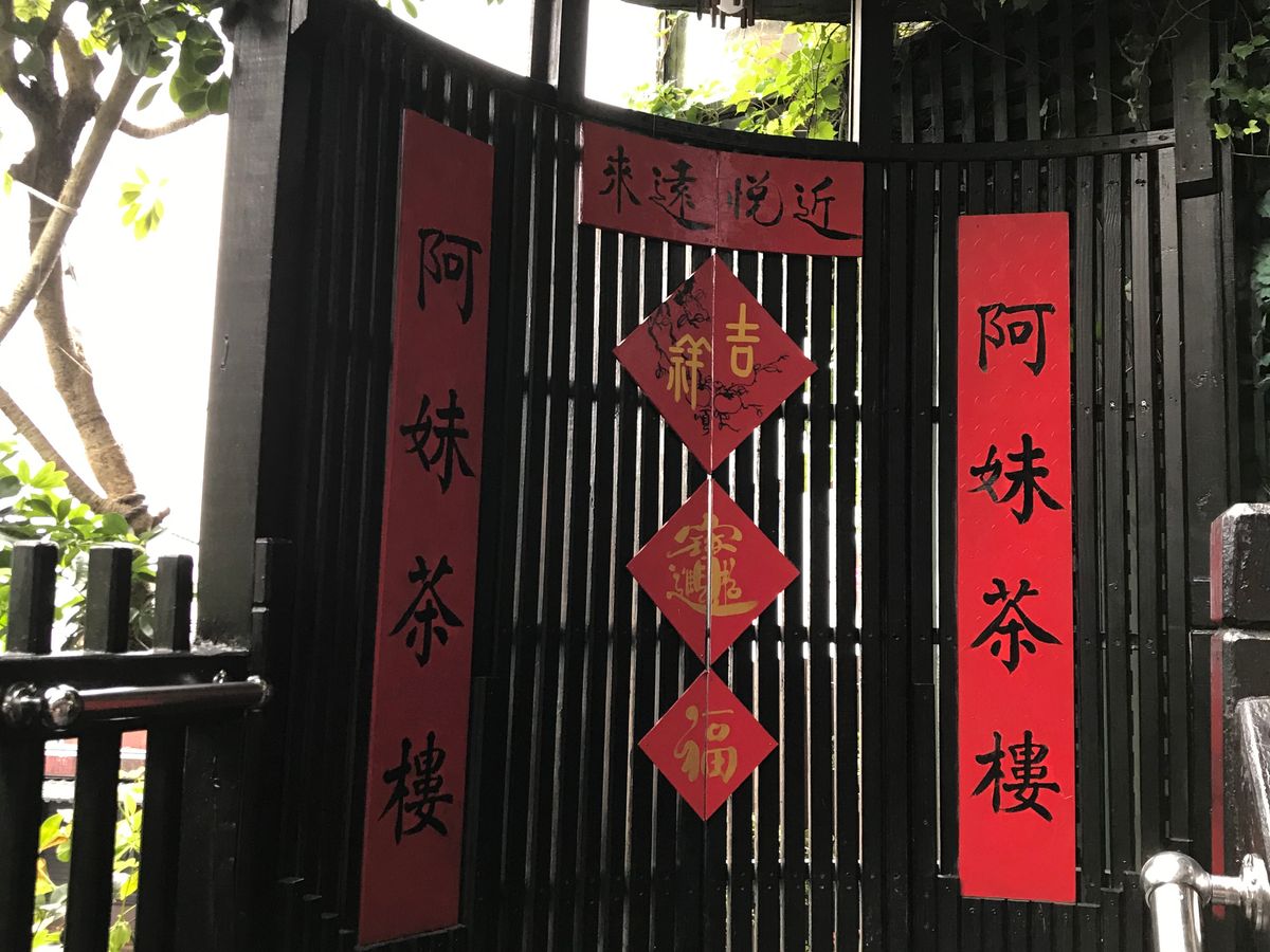 連日の雨予報でドキドキの中、現地に着くとちょうど雨も止み、人気の少なくなってきたのも幸いしてストレス無く歩くことが出来ました。ガイドのシさんには終始細やかに気を使っていただき、一番綺麗なトイレの場所や、テイクアウトもできる美味しい食べ物屋さんを教えていただいたりしてとても助かりました。阿妹茶樓にはテラス席と、冷房の効いている室内とを選べるようですが、もちろんここではテラス席を希望。満席に近いくらいに混んでいましたが、一番眺望の良さそうな場所に直ぐに案内してくださいました。