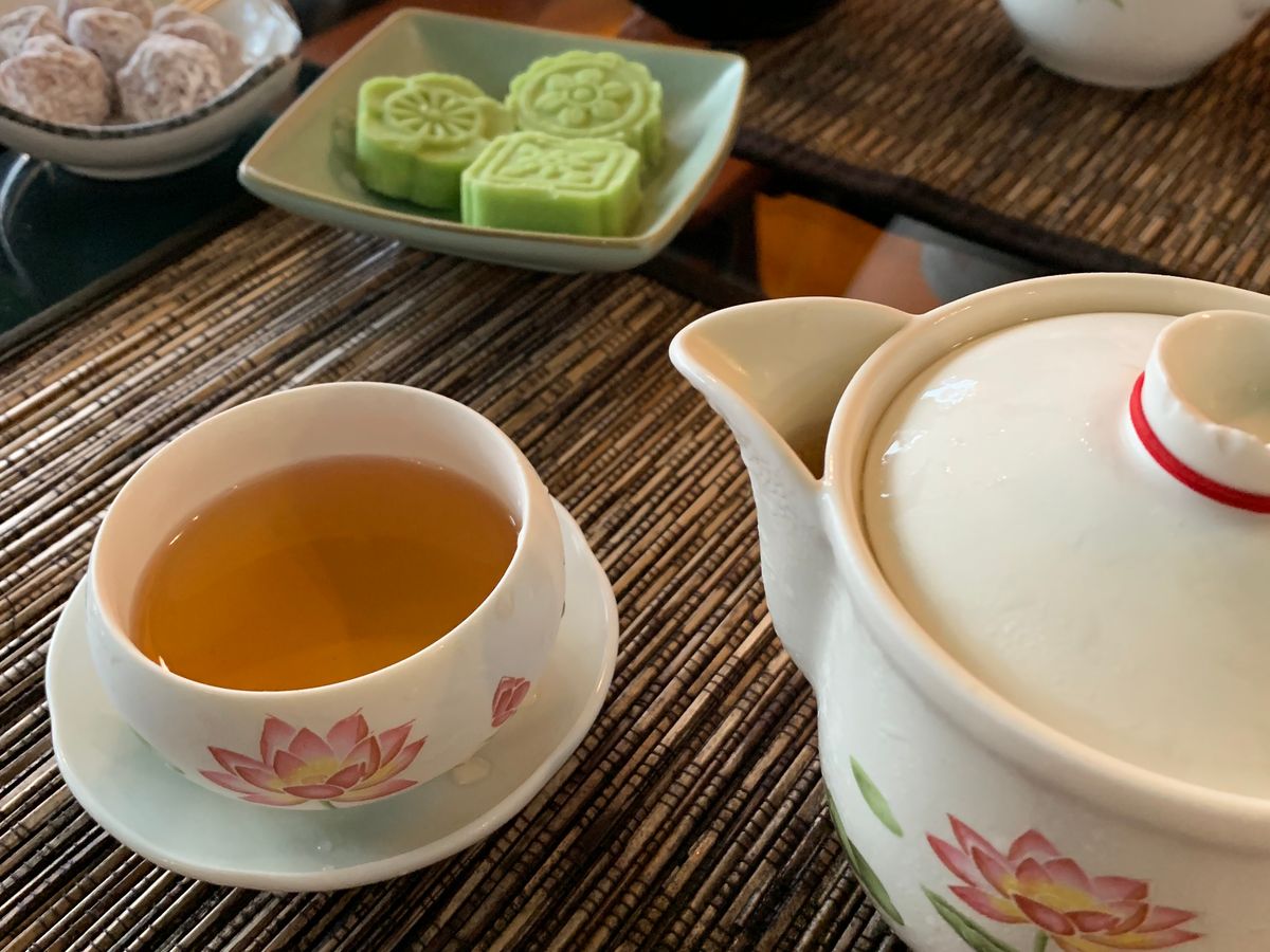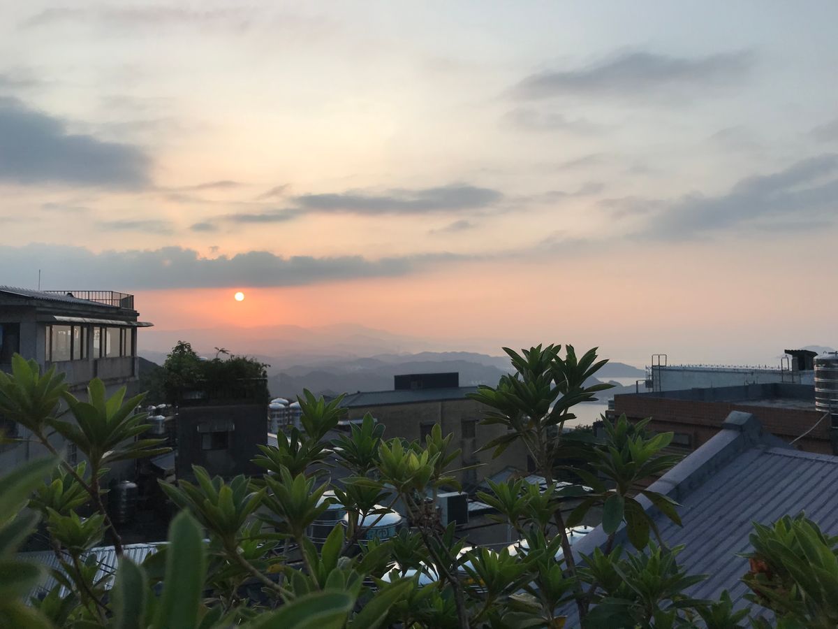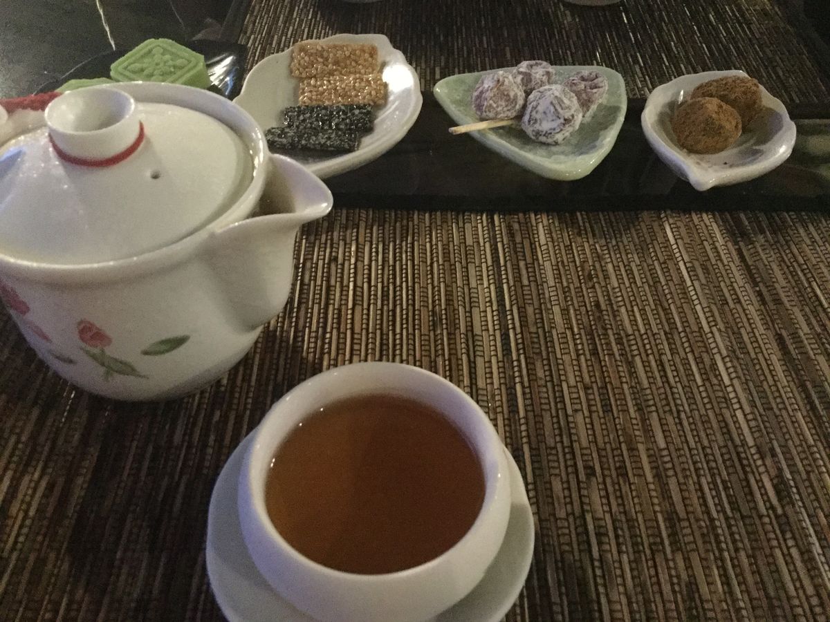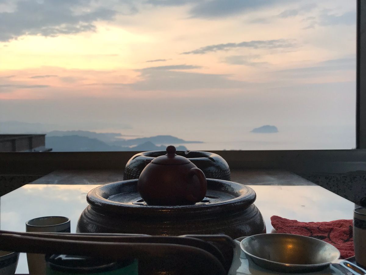 残念ながら、当日は曇っていたため綺麗な夕日は見れませんでしたが、もう日が沈んだ18時40分頃、再度「阿妹茶樓」に行くと並んでなく、念願のテラスでお茶ができました。1人300台湾ドルでお茶は飲み放題です。茶菓子も4種類出てきましたが、どれも甘さ控えめで、甘いものが苦手な方でも美味しくいただけると思います。