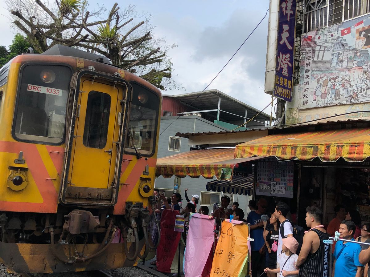 途中、電車が通るとき「電車くるよー」と大きな声で言われ線路からおろされて、電車がくるタイミングでも写真撮影。一時も時間を無駄にしないお兄さんたちの姿勢には「さすが台湾でも人気の観光地だけあるなー」と頭が下がるばかり。