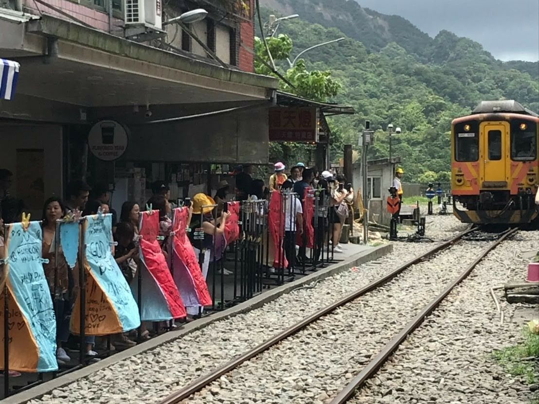十份天燈あげ:写真・動画はお店の方が撮ってくれます。電車がくる時間帯に調整してくれているので駅のわちゃわちゃする雰囲気も楽しめます笑