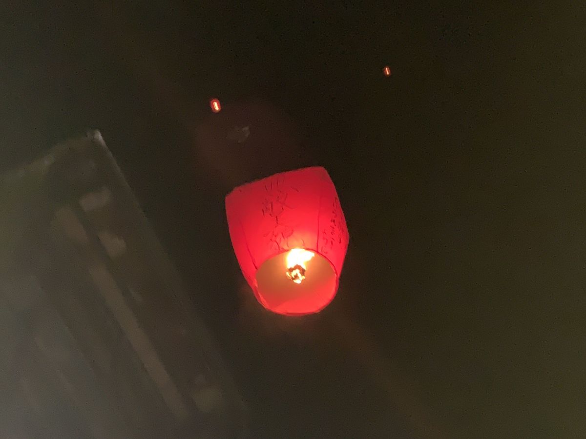 娘も孫も初めてだったので大喜びでした。天燈上げは遅い時間になったのですが、人もなく、夜空を独占できて、灯が消えるまで見守り感動でした。