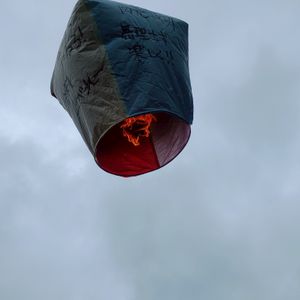 少し移動してランタン上げに挑戦。4面色違い(おすすめ)のランタンに健康や金運など筆で願い事を書き、神様に聞いてもらえるよう祈りながら線路を跨いで空へ上げました。