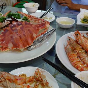 着くなり物凄い勢いで、カニはどう?ウニは?これ美味しいよ!などというようなことを中国語で話され、いくらか聞くと重さを図り、1万円以上の値段を提示され引いてしまいました。はっきりと断り、手頃な小ぶりの蟹と魚1匹、蛤のスープ、青菜炒め、焼きそばを頼みましたが、それでは足りない、お腹いっぱいにはならない!と言われましたがそれも断りました。