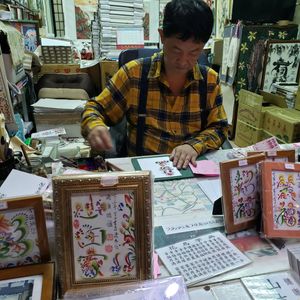 幸い平日だったせいか私たち家族だけのつあーでした。ガイドさんも混雑する階段をさけ、車で坂の上にある九扮のお店のある場所からツアーは開始、九分名物のオカリナやお茶、石鹸などの店に立ち寄ったあと、お目当てのの花文字の店屋さんによってもらい自分達だけのオリジナルな台湾の美術品を持ち帰ることができました。