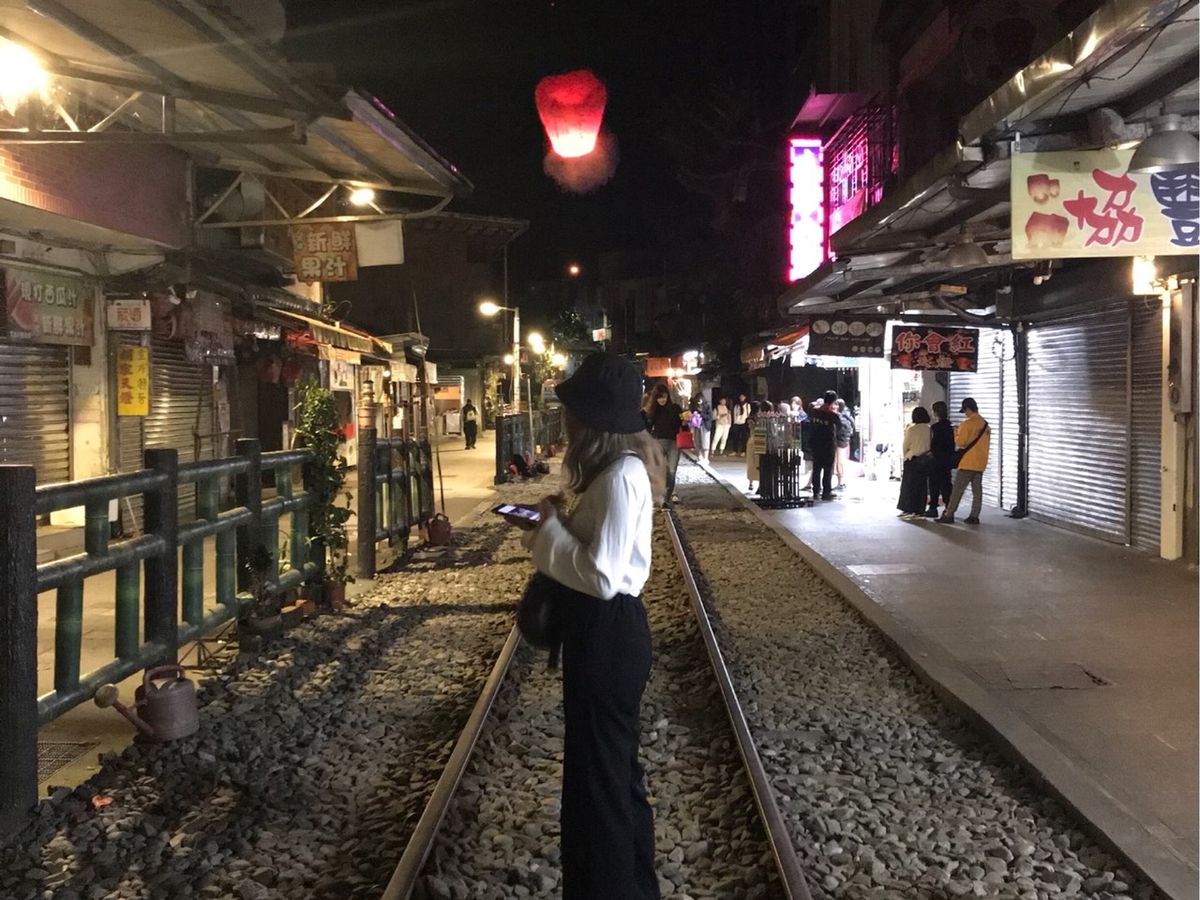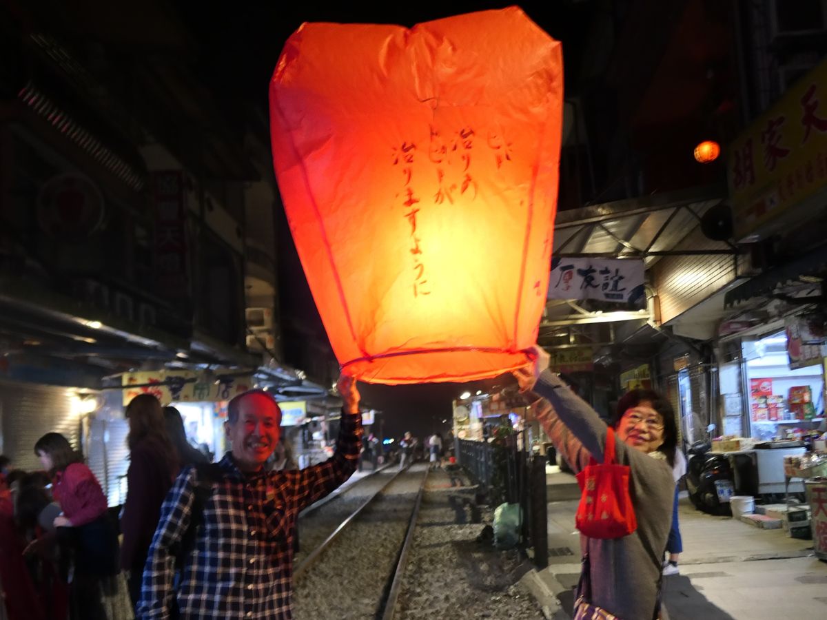 日本じゃ入れない線路に入って天燈上げ、願いを息子と考えながら楽しく書きました。空に飛んでいくのは一生の思い出になると思います。