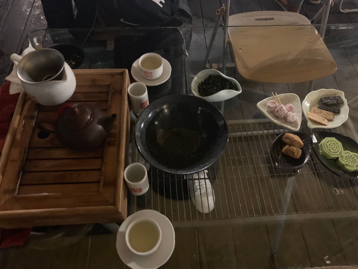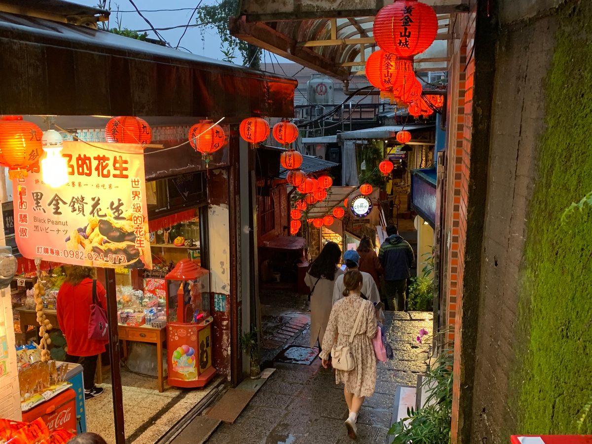 九份ではオススメのパイナップルケーキ屋さんを教えてくださり、美味しかったので買いました。お茶さんもとても素敵で、自由行動が2時間半くらいあったのでいっぱい食べて飲んでが出来て充実した時間でした。霧がすごく傘よりレインコートが、おすすめです。平日ですがものすごく混み合ってました。