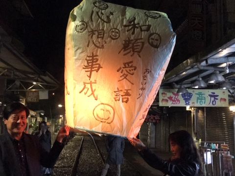 夜の九份で阿妹茶酒館を眺める絶景レストラン「海悦楼」で台湾ビールを飲みながら美味しい名物料理を堪能、周りの景色は「千と千尋の神隠し」の幻想体験、当日はあいにくの雨でしたが、これが更に雰囲気を良くしてくれました。また夜の十分では天燈に願い事を書いて線路上での天燈あげ体験、天燈の大きさに驚きと感動を覚えるとともに、金運、仕事運、健康運、希望の言葉を墨筆で自筆して熱気球風に飛ばす初体験で、願いよ天まで届けと願掛けをしました。