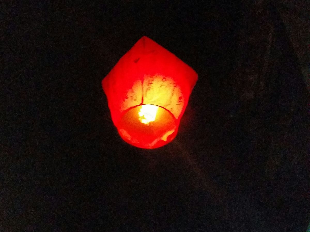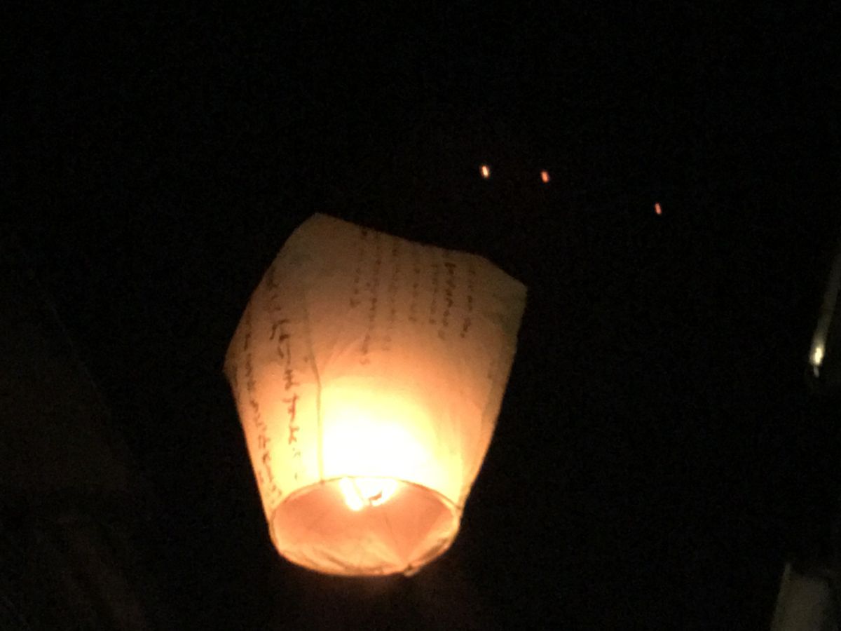 天燈あげは、夜空に私達の上げたひとつだけが昇っていき、願い事に込めた思いと共に、深く心に残る感動的な時間でした。