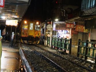 つづいて十分へ移動となりました。十分は別の山になるので、一旦山道を下りて高速道路に戻り、その先また山道を走っていきます。夕方出発プランでしたので陽が落ちて周囲は暗く、これは自力では絶対来られないなと思いました。この時間帯、十分のお店はほぼ閉店しており、ツアーの対応をしてくれる天燈屋さんだけが開いていました。人だかりでごった返す中を電車が通るというイメージとはだいぶ趣が異なりますが、ひっそりとしてこれはこれでいい雰囲気で、運良く電車が通るところも見ることができました。4面に墨で願い事を書き込んだ天燈は、点火し膨らんだところで手を離すとみるみる揚がっていき、小雨にも負けずにかなりの長時間高空を漂いながら、その灯りが消える最後まで見届けることができました。十分は九份のついでのつもりだったのですが、この夜の天燈上げにはじわーっと広がる感動があり、両方行って大正解でした。ちなみにドライバーさんが動画や写真を撮ってくれました。最後に台北市内のホテルまで送ってもらって終了になりました。夕方から夜の時間帯で、さらに大雨の中でしたが、安全無事に観光できたのはチャータープランだったおかげではないかと思いました。ドライバーさんに感謝です。