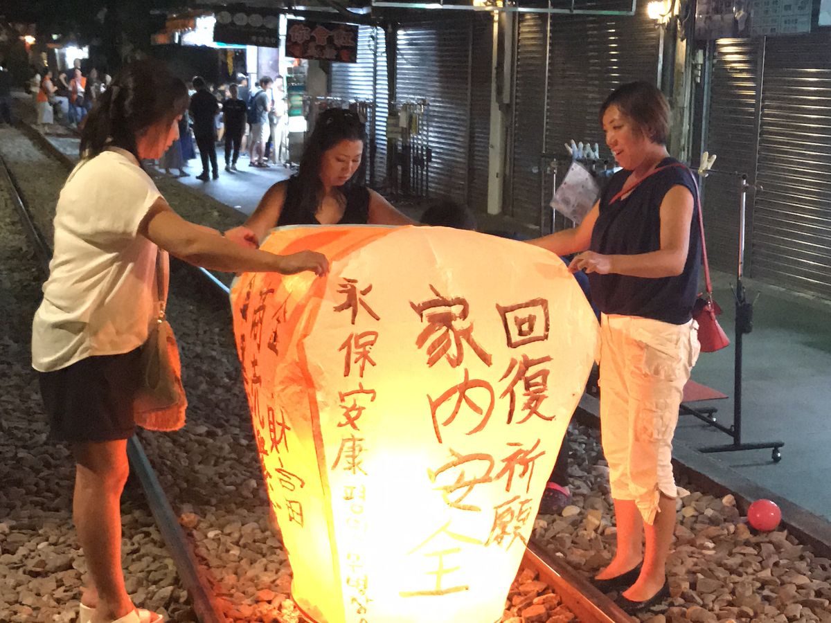 夜の十分はとても幻想的でランタンに願い事を書いて、線路の上で飛ばしてテンションが上がりました(≧∀≦)