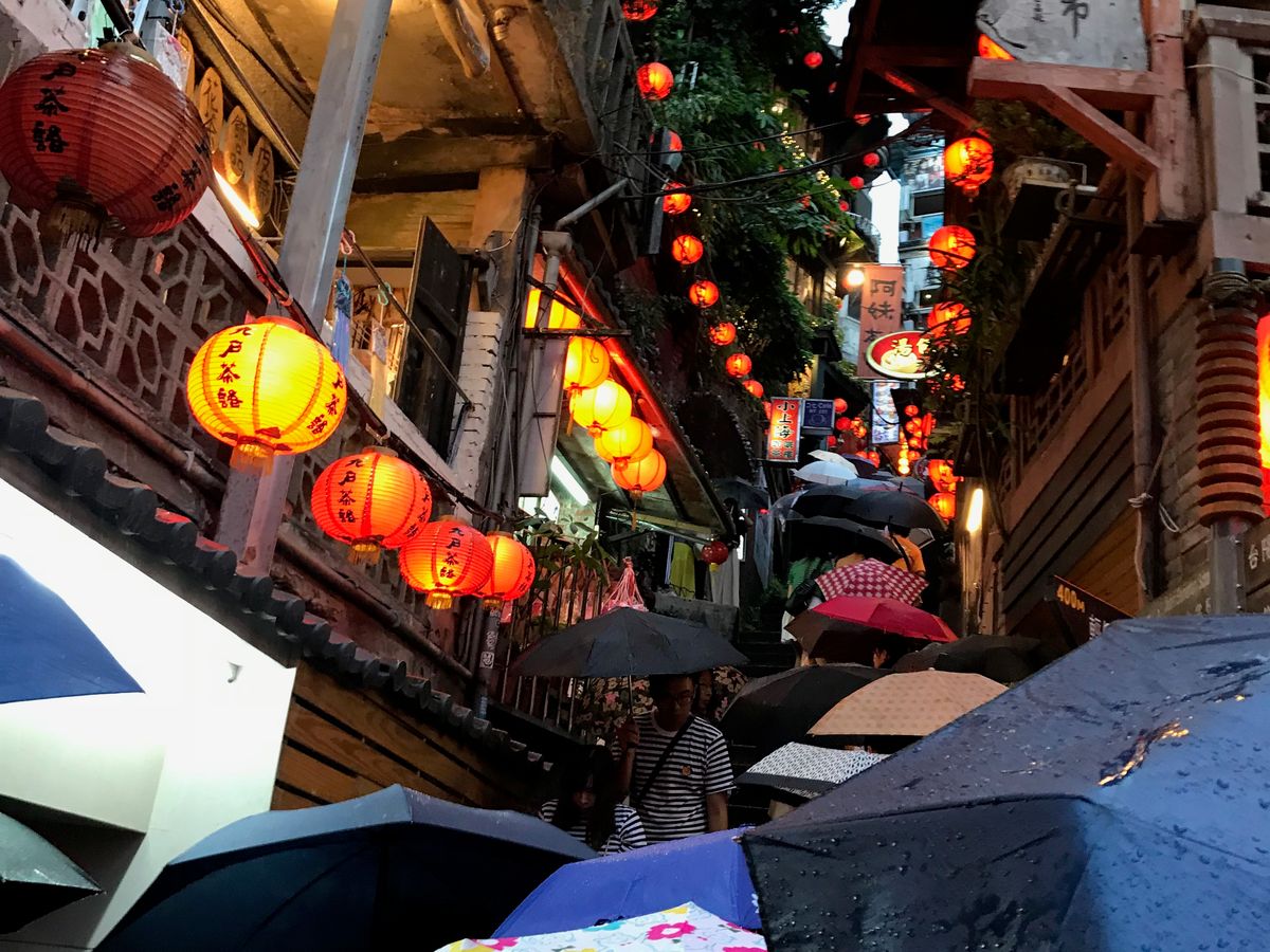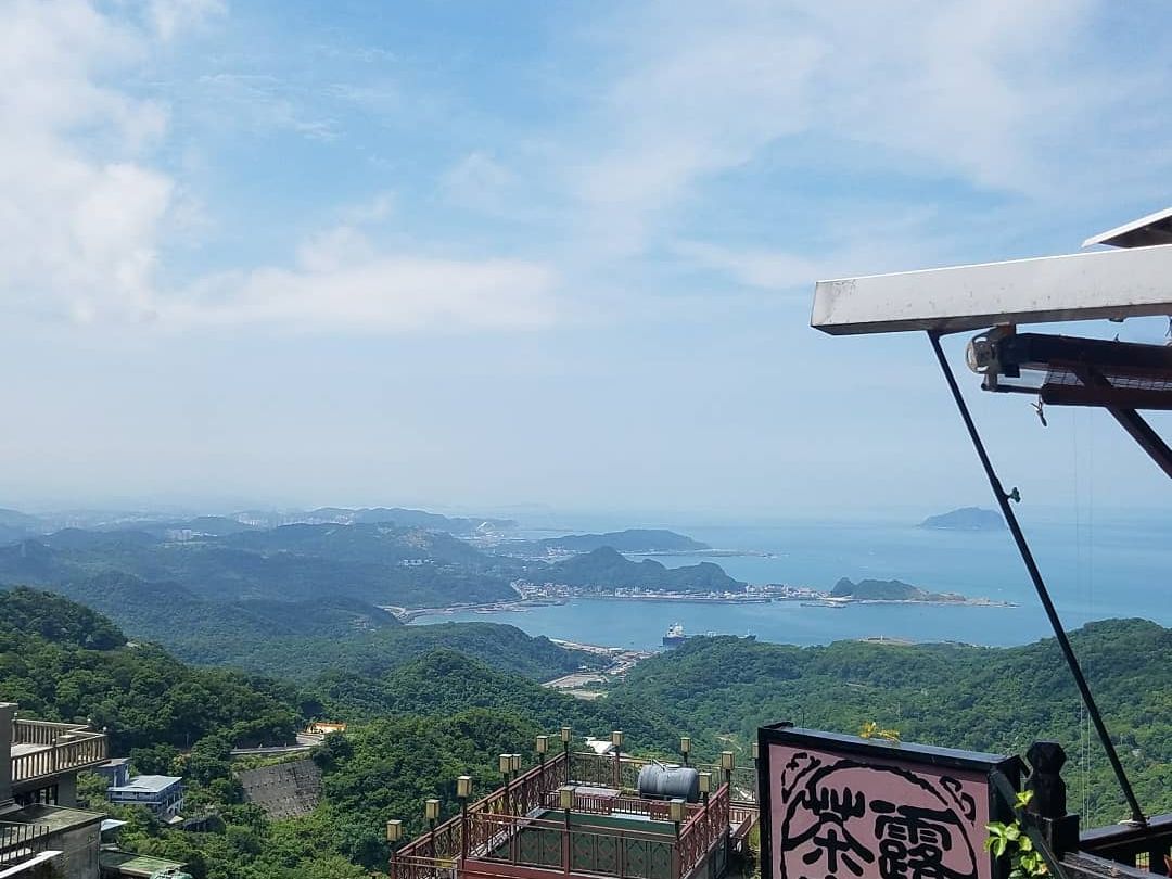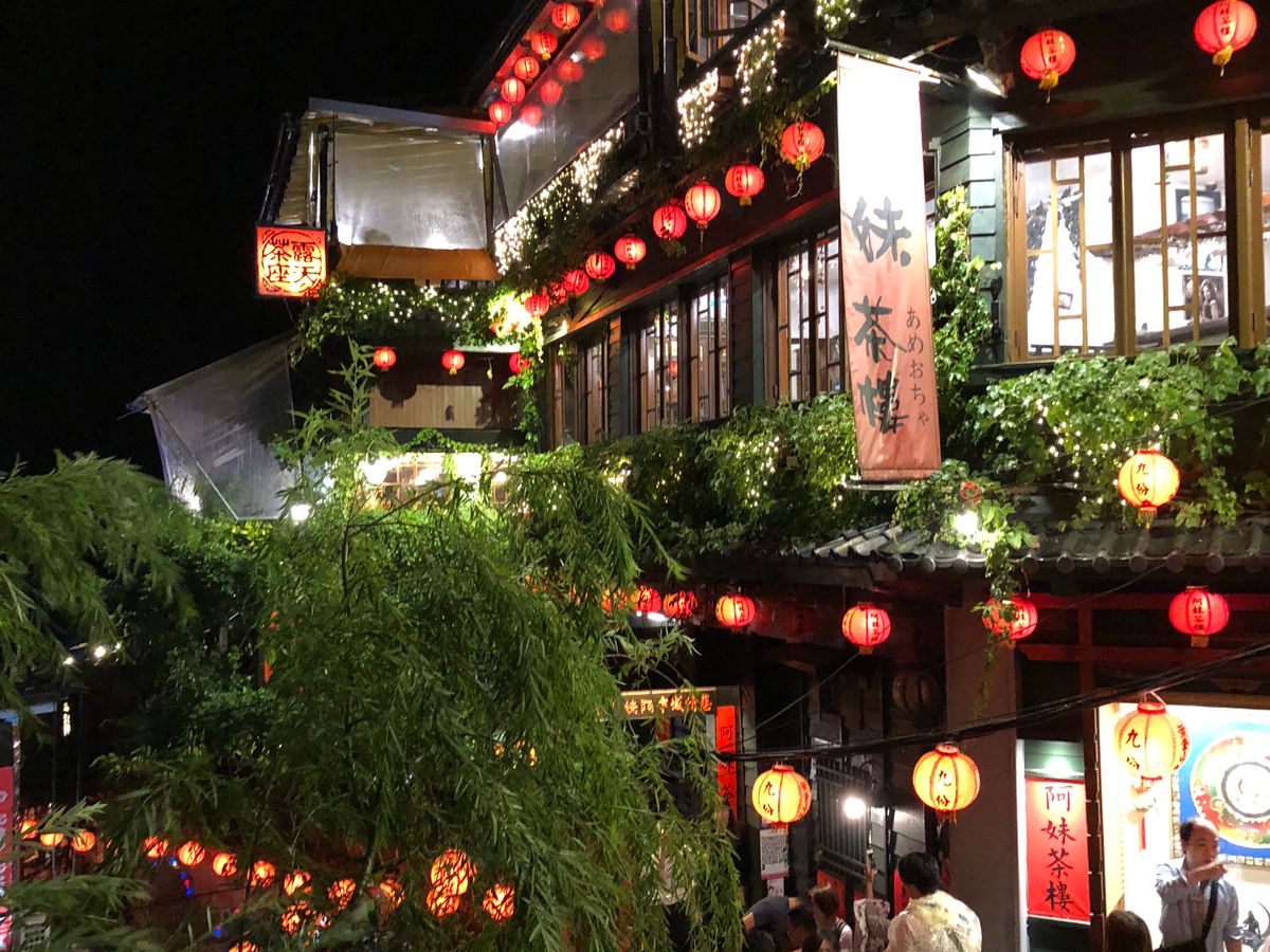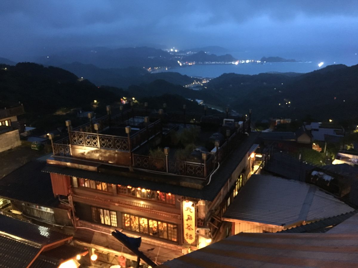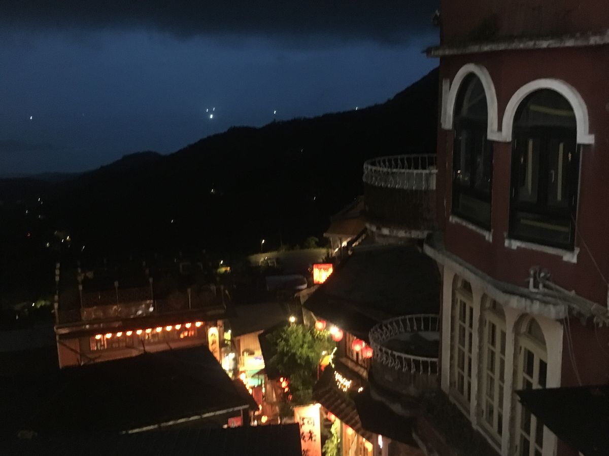 当日、十分では小雨の中、滝の見学とランタン上げ。そのあと九份に移動し、千と千尋の神隠しの湯老婆で有名な阿妹茶酒館に入りましたが、ガイドさんがお店に顔が効くようで景色の良い窓側の素敵な席に案内して頂きました!しばらくするとあたりはカミナリを伴う土砂降りの雨に。