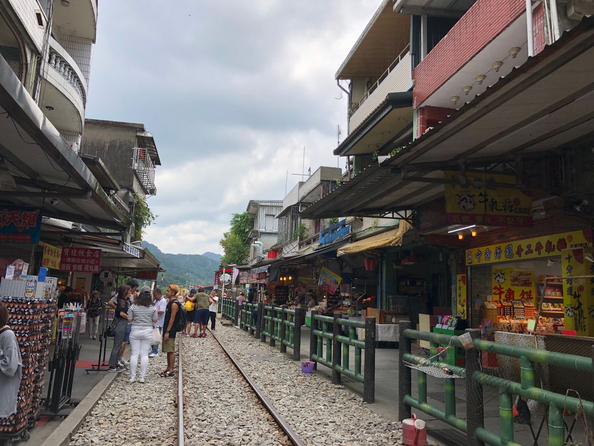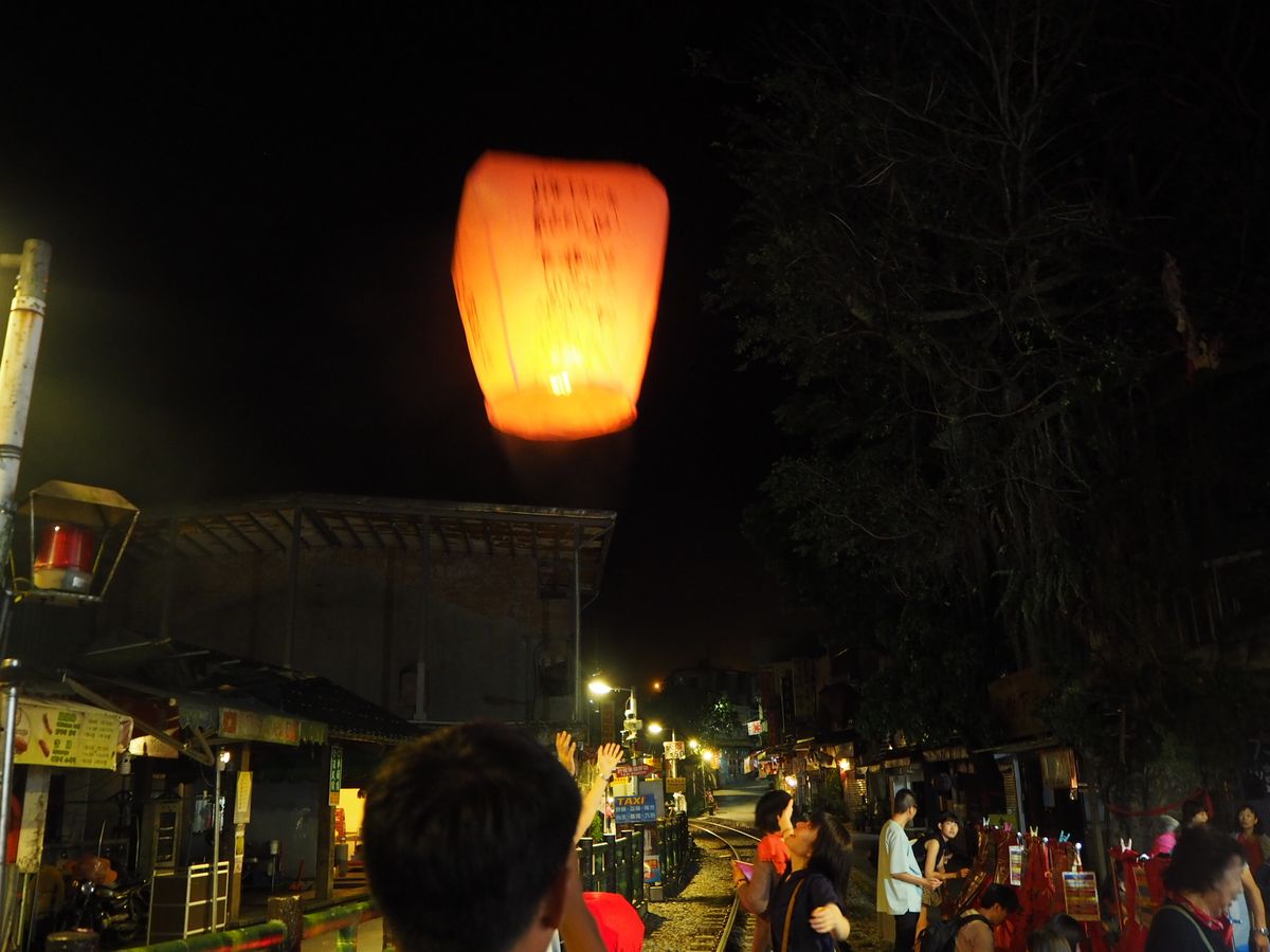 十分の天燈上げは、時おり電車が通り過ぎる線路の上で飛ばす、という面白いものでした。係りのお店の方が、てきぱきと方法を教えてくれ、いざ飛ばす時のスマホ撮影もお任せ。夜空に上がっていく自分達の天燈を見上げていられました。とても素敵な経験をすることが出来ました。