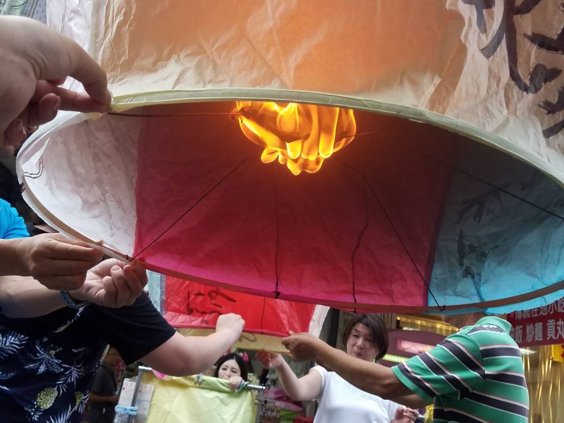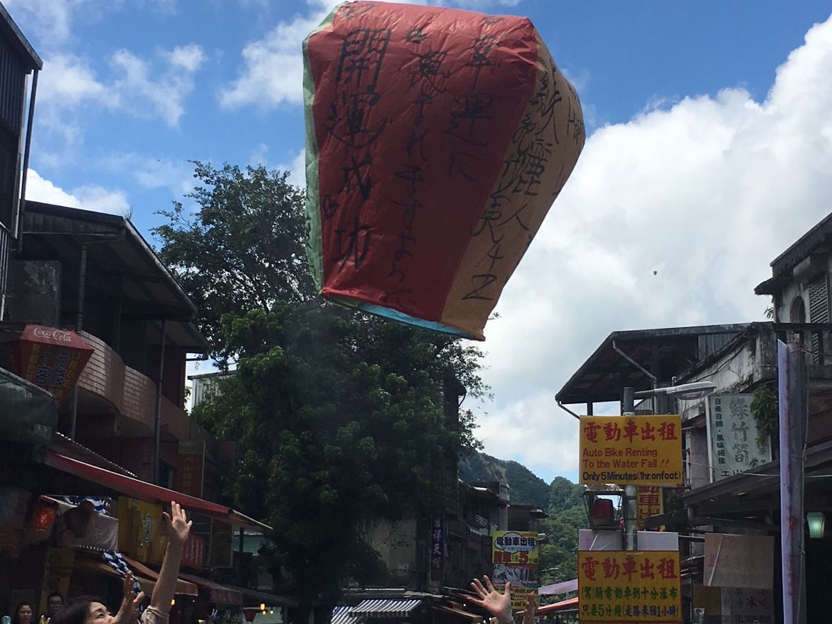 十分 天燈は思った以上に勢いよく上がる。店の兄ちゃんの通りすると、簡単だ。面白かった。