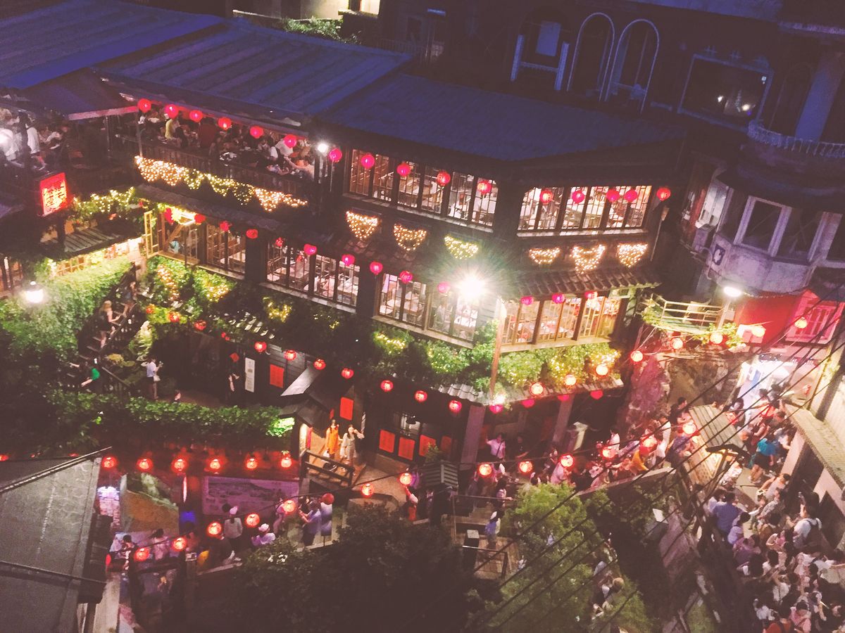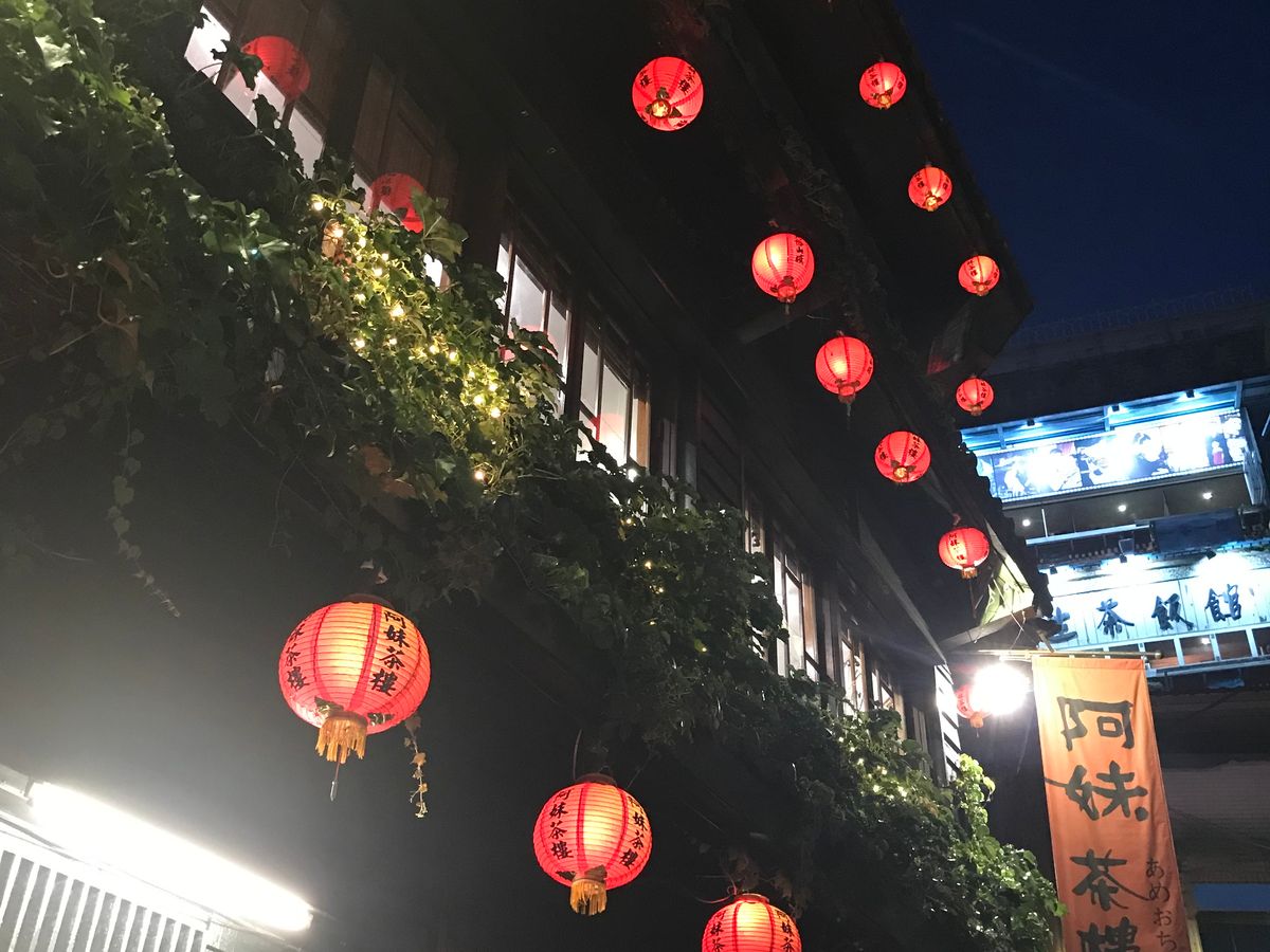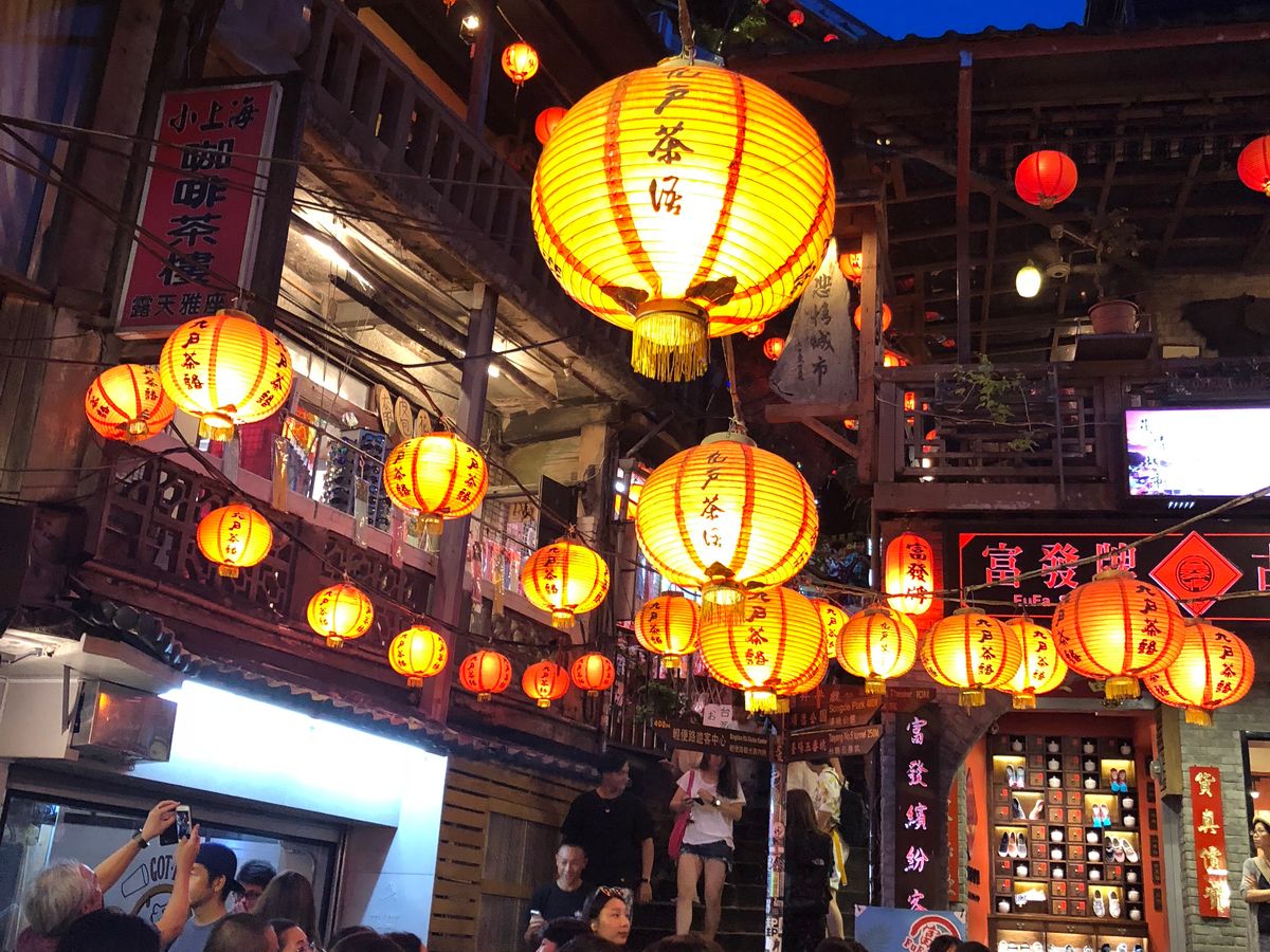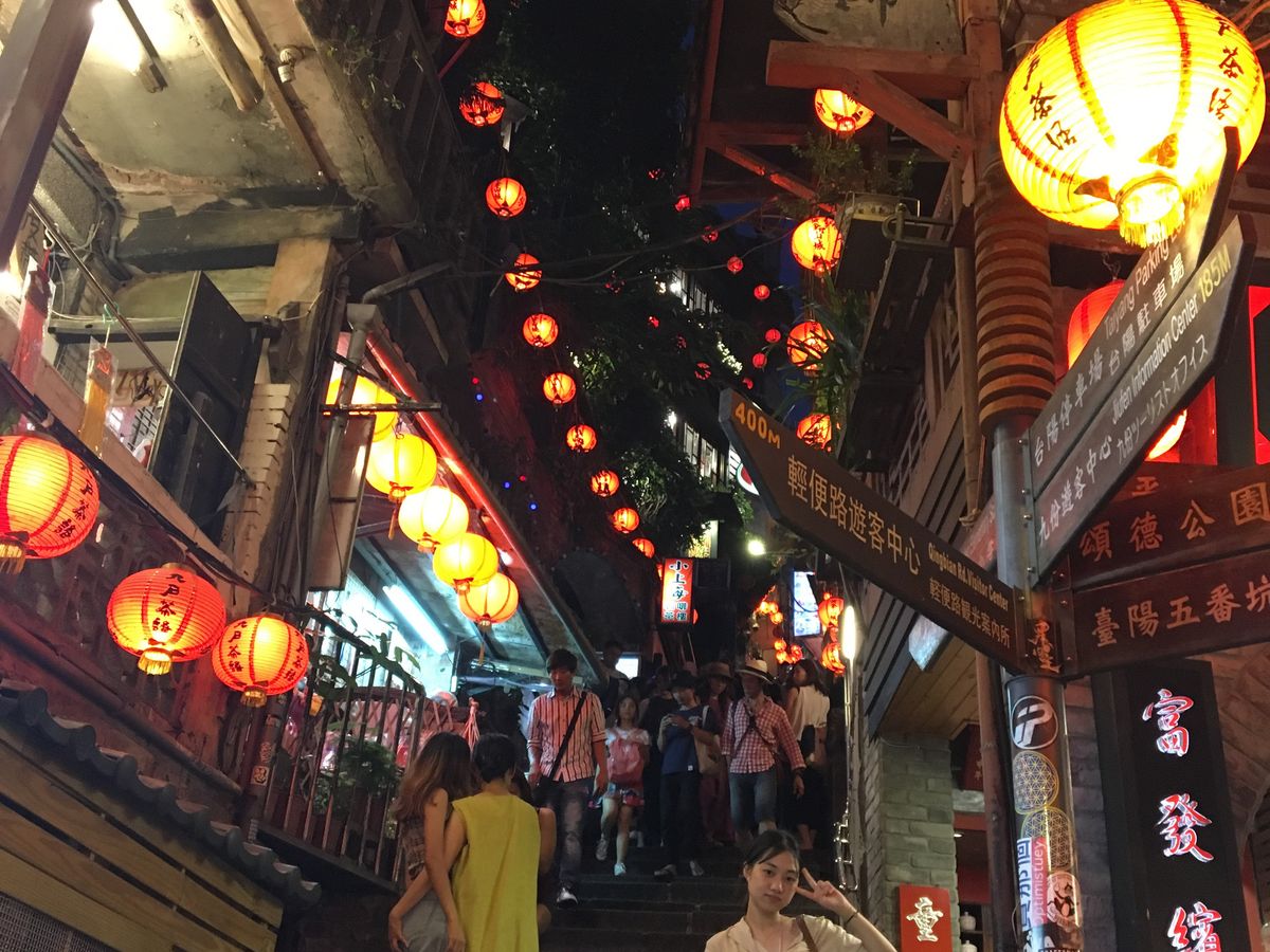 茶館で海の方角へ沈みゆく夕陽を眺めながら、おかわり自由の美味しいお茶とお菓子を頂きました。暗くなったら提灯が点灯し、お土産や食べ物屋さんで賑わう通りから、猫が欠伸する路地裏までぶらぶら散歩しました。ゆっくり堪能してバスに戻ると、ガイドさんがノンストップで台北観光のことから台湾の経済状況まで、ユーモアいっぱいに話して下さり、車内は笑いが絶えなかったです。移動は大抵寝ている私ですが、このときは興味深いお話に夢中で、一時間があっという間でした。
