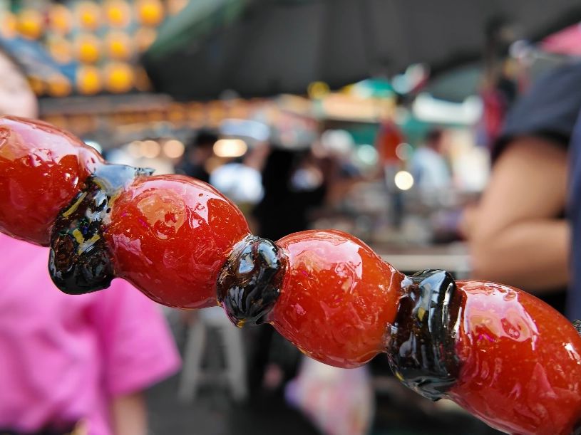 その後訪れた基隆廟口夜市では、食べものすべてが美味しく、大満足でした。特に、プチトマトとシロップ漬けした梅を串にして、りんご飴のようにコーティングされたお菓子がとても美味しく、印象に残っています。