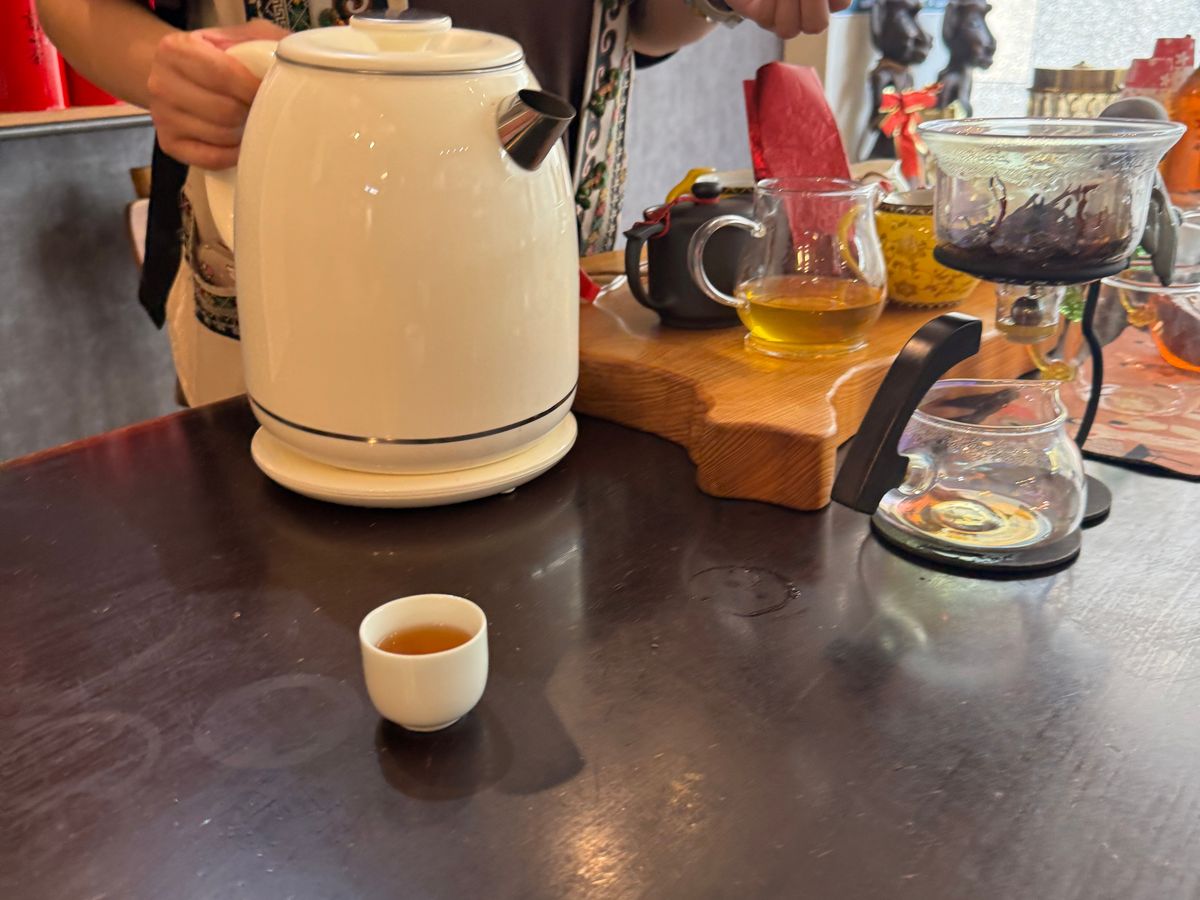 まず九份に入ると、車でいけるギリギリの所までは車で入り、駐車場で降りてから坂道をちょっと上がって、お茶屋さんで試飲会をしました。台湾の原住民族が作っているという高級茶を頂き、美味しかったです。