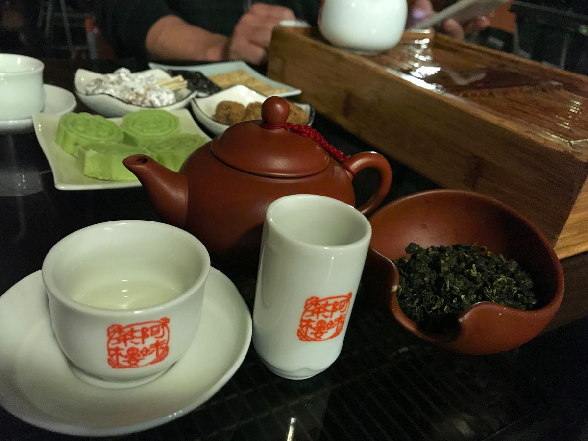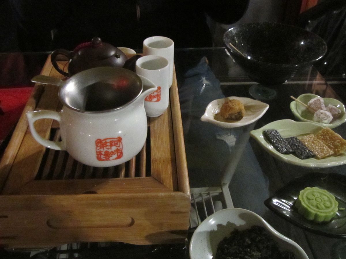 このツアーは少し早い時間につくようで(といっても,辺りはすでに暗くなっていましたが),阿妹茶樓にも待つことなく入店。台湾式のお茶を体験してきました。茶葉がいっぱいあったので,周りが何回転もする中,ずっとお茶を飲んでいました(笑)