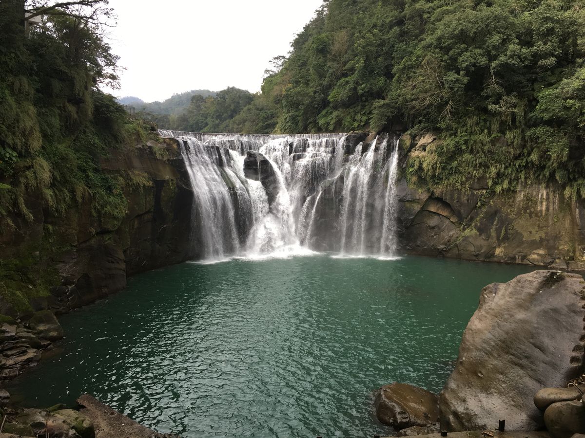 台北駅近のホテルエントランスにてドライバーさんと待ち合わせをし、バンに乗り込み、まずは十分滝へ。