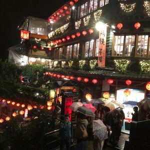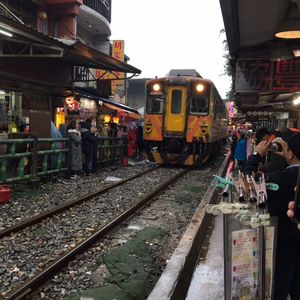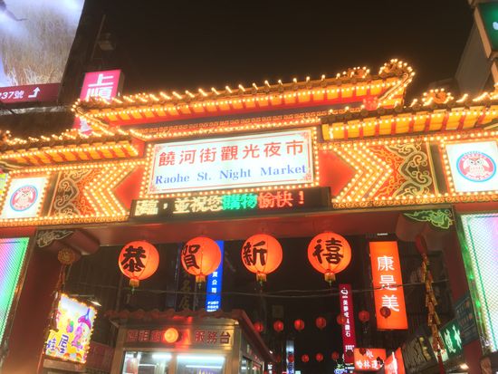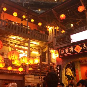 折りたたみの傘のみでしたがカッパがあればよかった様です。着いてすぐは修学旅行生が多く人気の写真スポット辺りはごった返し歩くのも困難一先ず食事した後はもう人も疎らで写真撮りも楽々でした夜市も雨&時間も遅めの為か空いて居て観て周るのも楽しめました。夜市の入り口は煌びやかな装飾で黄色いタクシーも絵になって台湾らしかったです✨