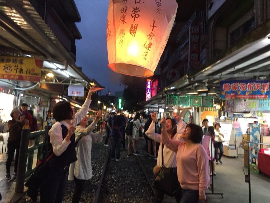 朝8時に台北市内のホテルでピックアップしていただき、まず十分の滝へ!台湾のナイアガラと呼ばれる滝(スケールはかなりちっちゃいかも、笑)でマイナスイオンをふんだんに浴び、スッキリした気分で次の十分老街に移動。久しぶりに筆で文字を書くことを楽しみながら、それぞれの色に対応した願いごとを四字熟語から選んで真剣に書きました♪線路での天燈上げはちょっとした風向きの変化でちょっぴりドッキリも味わいましたが、上空高く天燈が上がっていく様を写真やビデオも撮影していただけ、とても思い出深いものになりました。