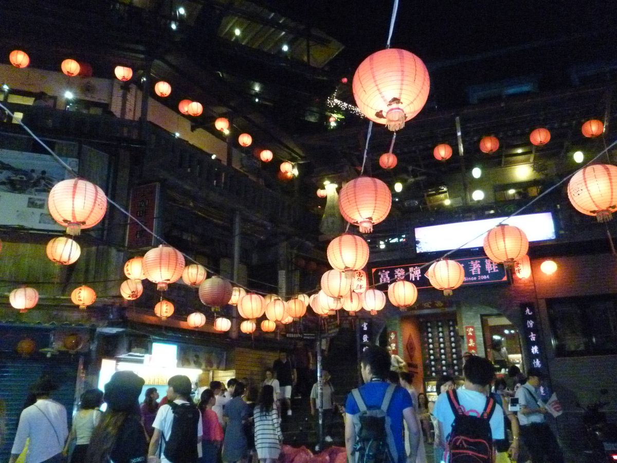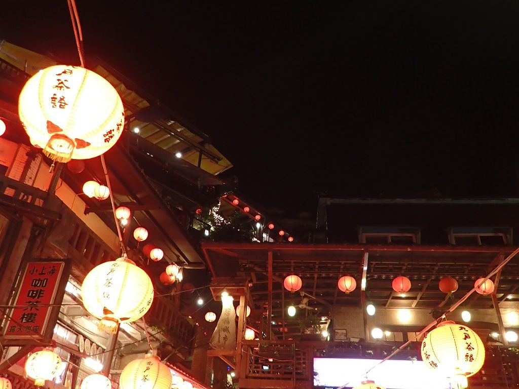 雨の夜、(九分は1年の半分は雨だと)こちらのツアーで10台のバス、九分に着くとほとんどの人が登るのが階段の狭い1本道、降りてくる人のいますのでまるで動かなく、やっと8分上がると横に1本の道、つまり十の字の道が観光客が通るところです。ここの両側にお店が、でも夜景が見れない、上の有名なスイーツ屋さんで窓側に座って食べたのですが、どこかの田舎の夜景?写真のような夜景は?がっかりです。