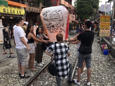 ただ、参加者が多かったせいか集合時間になっても全員が集まらず、出発時間が遅れてしまったのは残念でした。時間配分も、十分の滝の滞在時間や天燈上げの時間が少し長いように感じましたが、天燈上げのときはたくさん写真を撮ってもらうこともでき、いい思い出ができましたし天燈の形をしたお守りみたいなものもカラフルでよいお土産になりました。線路の上で天燈を上げるのですが、自由時間で線路の上でを自由に歩けるのも面白かったです。