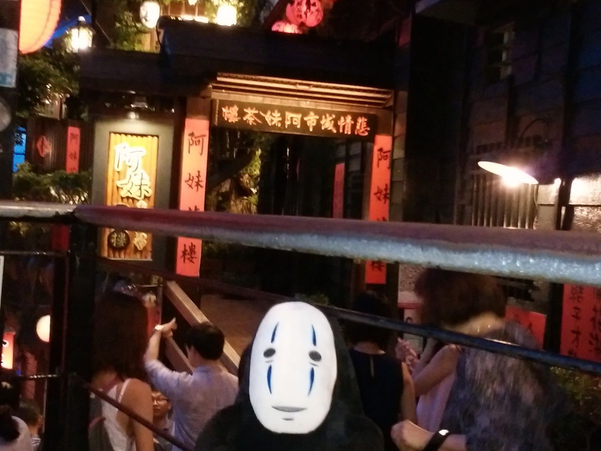 誰の物かわかりませんが、茶楼の前の小さな休憩地にカオナシのぬいぐるみが。被写体にピッタリです。