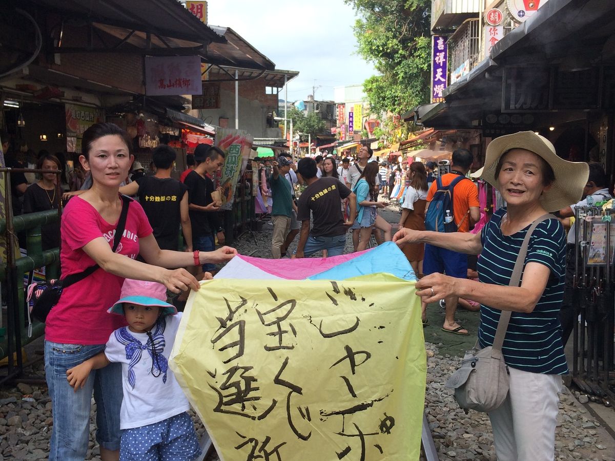 十分ではランタンにお願いを書く姿やあげる瞬間などの写真・動画をお店の方と手分けして撮って下さいました。その後、十分の見所をガイドしながら線路の上や十分幸福の壁でのショットも沢山撮って下さいました。