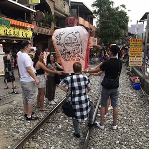まず十分の天燈上げは線路沿いで願い事を天燈に書き、線路上で天燈を上げるというなかなか出来ない体験をさせてもらいました。お店の方も非常に優しく、天燈を上げるときの動画も撮影してもらいました。また目の前の天燈を上げた場所に電車が通り、不思議な感覚を体験しました。